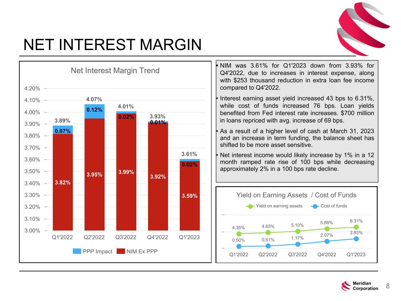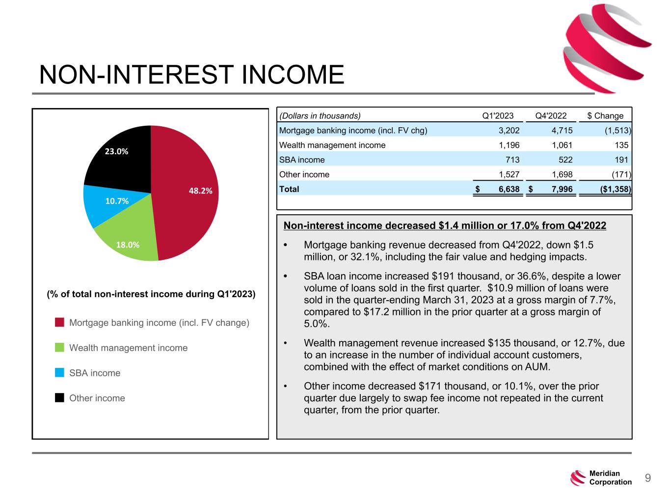 239 15 75 111 111 113 186 12 47 0 0 0 234 234 234 186 12 0 112 173 71 8Meridian Corporation Net Interest Margin Trend 3.89% 4.07% 4.01% 3.93% 3.61% 3.82% 3.95% 3.99% 3.92% 3.59% 0.07% 0.12% 0.02% 0.01% 0.02% PPP Impact NIM Ex PPP Q1'2022 Q2'2022 Q3'2022 Q4'2022 Q1'2023 3.00% 3.10% 3.20% 3.30% 3.40% 3.50% 3.60% 3.70% 3.80% 3.90% 4.00% 4.10% 4.20% NET INTEREST MARGIN • NIM was 3.61% for Q1'2023 down from 3.93% for Q4'2022, due to increases in interest expense, along with $253 thousand reduction in extra loan fee income compared to Q4'2022. • Interest earning asset yield increased 43 bps to 6.31%, while cost of funds increased 76 bps. Loan yields benefited from Fed interest rate increases. $700 million in loans repriced with avg. increase of 69 bps. • As a result of a higher level of cash at March 31, 2023 and an increase in term funding, the balance sheet has shifted to be more asset sensitive. • Net interest income would likely increase by 1% in a 12 month ramped rate rise of 100 bps while decreasing approximately 2% in a 100 bps rate decline. Yield on Earning Assets / Cost of Funds 4.35% 4.65% 5.10% 5.88% 6.31% 0.50% 0.61% 1.17% 2.07% 2.83% Yield on earning assets Cost of funds Q1'2022 Q2'2022 Q3'2022 Q4'2022 Q1'2023