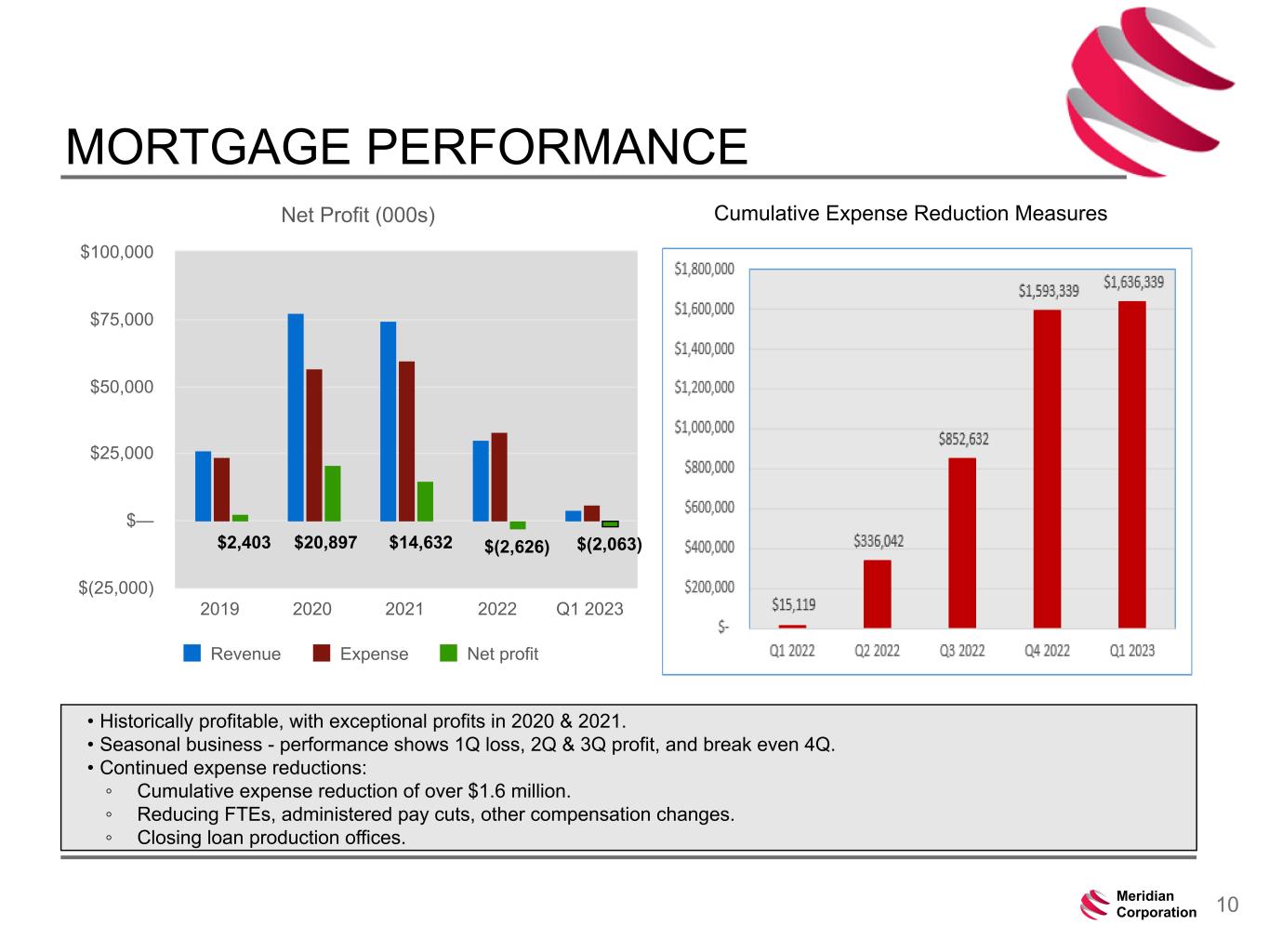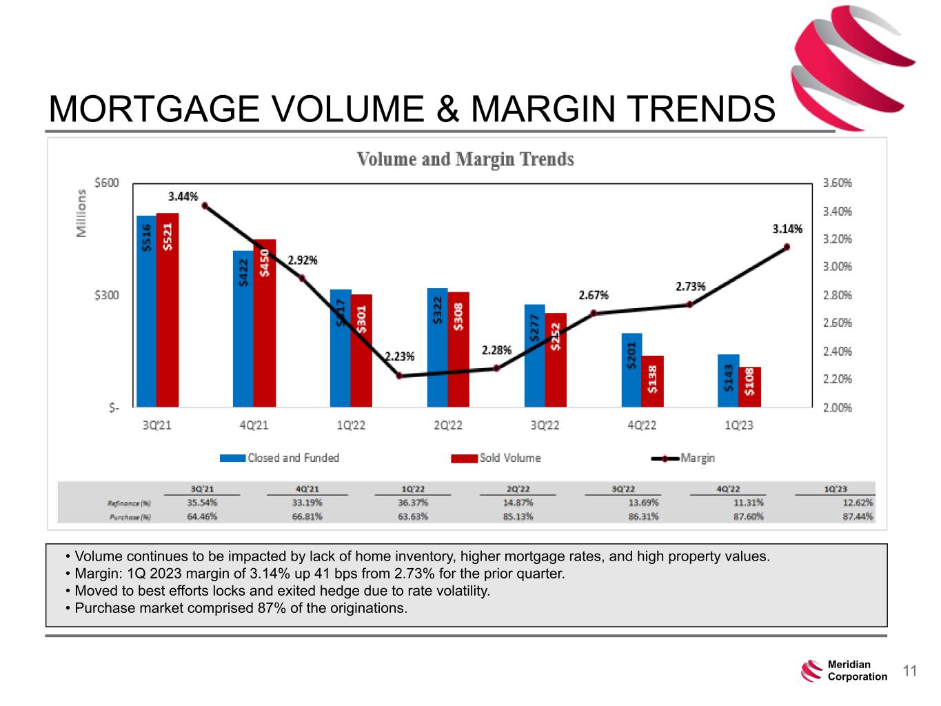 239 15 75 111 111 113 186 12 47 0 0 0 234 234 234 186 12 0 112 173 71 10Meridian Corporation MORTGAGE PERFORMANCE • Historically profitable, with exceptional profits in 2020 & 2021. • Seasonal business - performance shows 1Q loss, 2Q & 3Q profit, and break even 4Q. • Continued expense reductions: ◦ Cumulative expense reduction of over $1.6 million. ◦ Reducing FTEs, administered pay cuts, other compensation changes. ◦ Closing loan production offices. Net Profit (000s) $(2,626) $(2,063) Revenue Expense Net profit 2019 2020 2021 2022 Q1 2023 $(25,000) $— $25,000 $50,000 $75,000 $100,000 $14,632$20,897$2,403 Cumulative Expense Reduction Measures