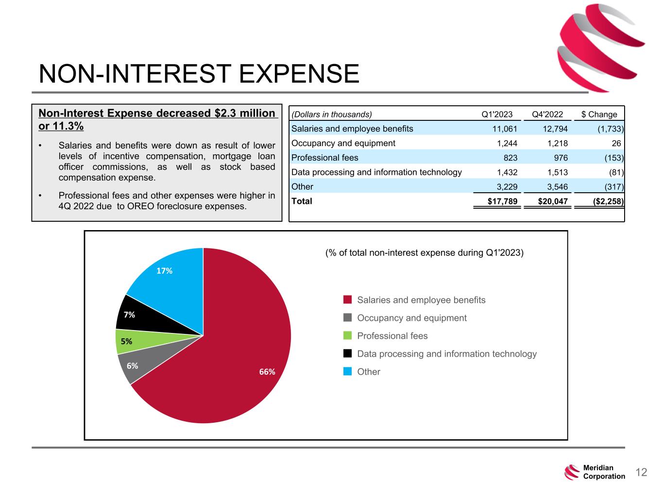 239 15 75 111 111 113 186 12 47 0 0 0 234 234 234 186 12 0 112 173 71 12Meridian Corporation NON-INTEREST EXPENSE Non-Interest Expense decreased $2.3 million or 11.3% • Salaries and benefits were down as result of lower levels of incentive compensation, mortgage loan officer commissions, as well as stock based compensation expense. • Professional fees and other expenses were higher in 4Q 2022 due to OREO foreclosure expenses. 66% 6% 5% 7% 17% Salaries and employee benefits Occupancy and equipment Professional fees Data processing and information technology Other (% of total non-interest expense during Q1'2023) (Dollars in thousands) Q1'2023 Q4'2022 $ Change Salaries and employee benefits 11,061 12,794 (1,733) Occupancy and equipment 1,244 1,218 26 Professional fees 823 976 (153) Data processing and information technology 1,432 1,513 (81) Other 3,229 3,546 (317) Total $17,789 $20,047 ($2,258)