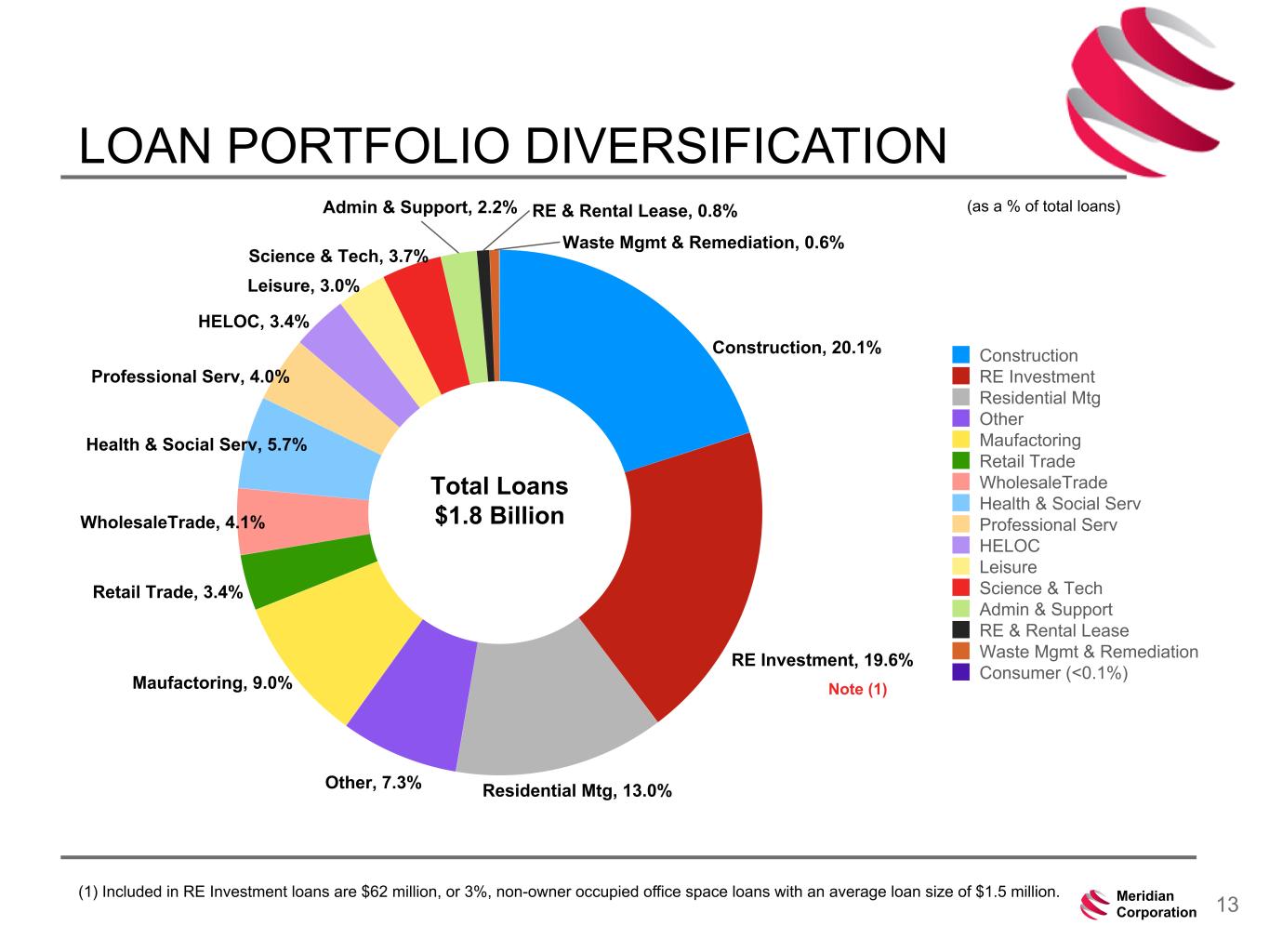 239 15 75 111 111 113 186 12 47 0 0 0 234 234 234 186 12 0 112 173 71 13Meridian Corporation Construction, 20.1% RE Investment, 19.6% Residential Mtg, 13.0%Other, 7.3% Maufactoring, 9.0% Retail Trade, 3.4% WholesaleTrade, 4.1% Health & Social Serv, 5.7% Professional Serv, 4.0% HELOC, 3.4% Leisure, 3.0% Science & Tech, 3.7% Admin & Support, 2.2% RE & Rental Lease, 0.8% Waste Mgmt & Remediation, 0.6% Construction RE Investment Residential Mtg Other Maufactoring Retail Trade WholesaleTrade Health & Social Serv Professional Serv HELOC Leisure Science & Tech Admin & Support RE & Rental Lease Waste Mgmt & Remediation Consumer (<0.1%) LOAN PORTFOLIO DIVERSIFICATION Total Loans $1.8 Billion Note (1) (as a % of total loans) (1) Included in RE Investment loans are $62 million, or 3%, non-owner occupied office space loans with an average loan size of $1.5 million.
