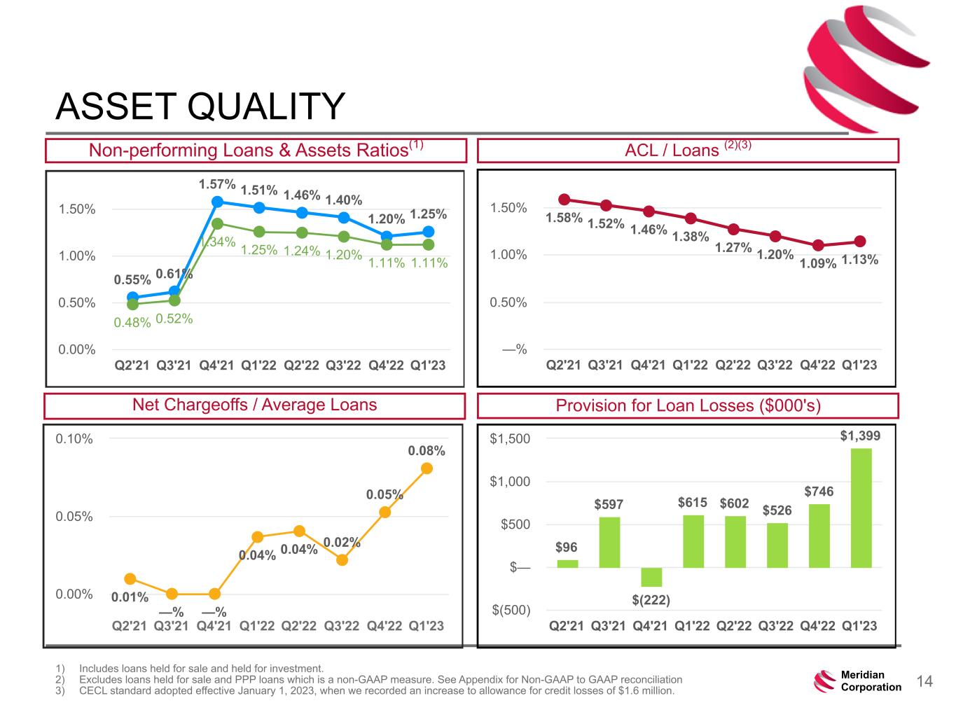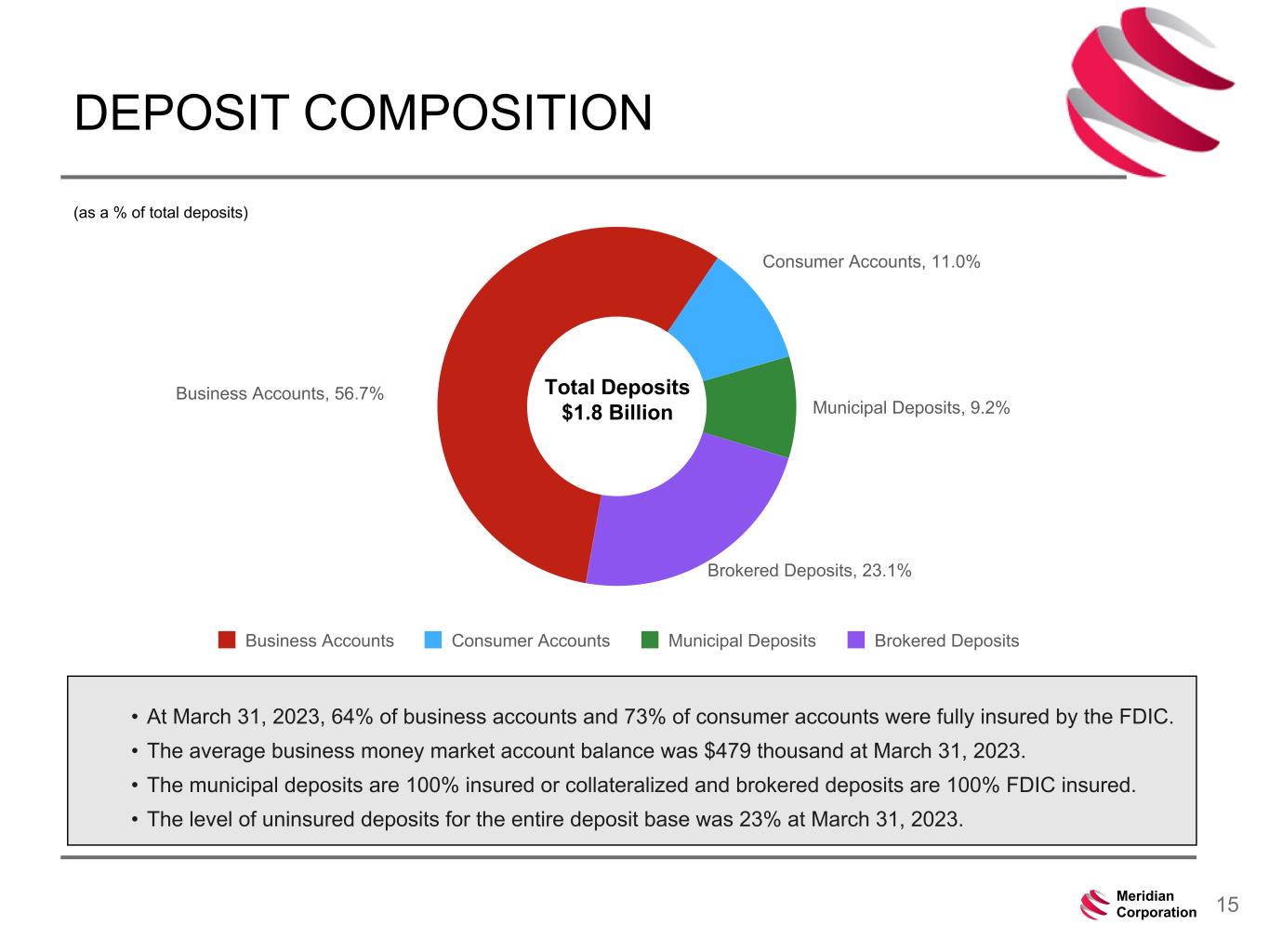 239 15 75 111 111 113 186 12 47 0 0 0 234 234 234 186 12 0 112 173 71 14Meridian Corporation 1.58% 1.52% 1.46% 1.38% 1.27% 1.20% 1.09% 1.13% Q2'21 Q3'21 Q4'21 Q1'22 Q2'22 Q3'22 Q4'22 Q1'23 —% 0.50% 1.00% 1.50% ASSET QUALITY 1) Includes loans held for sale and held for investment. 2) Excludes loans held for sale and PPP loans which is a non-GAAP measure. See Appendix for Non-GAAP to GAAP reconciliation 3) CECL standard adopted effective January 1, 2023, when we recorded an increase to allowance for credit losses of $1.6 million. Non-performing Loans & Assets Ratios(1) Net Chargeoffs / Average Loans ACL / Loans (2)(3) 0.55% 0.61% 1.57% 1.51% 1.46% 1.40% 1.20% 1.25% 0.48% 0.52% 1.34% 1.25% 1.24% 1.20% 1.11% 1.11% Q2'21 Q3'21 Q4'21 Q1'22 Q2'22 Q3'22 Q4'22 Q1'23 0.00% 0.50% 1.00% 1.50% 0.01% —% —% 0.04% 0.04% 0.02% 0.05% 0.08% Q2'21 Q3'21 Q4'21 Q1'22 Q2'22 Q3'22 Q4'22 Q1'23 0.00% 0.05% 0.10% $96 $597 $(222) $615 $602 $526 $746 $1,399 Q2'21 Q3'21 Q4'21 Q1'22 Q2'22 Q3'22 Q4'22 Q1'23 $(500) $— $500 $1,000 $1,500 Provision for Loan Losses ($000's)