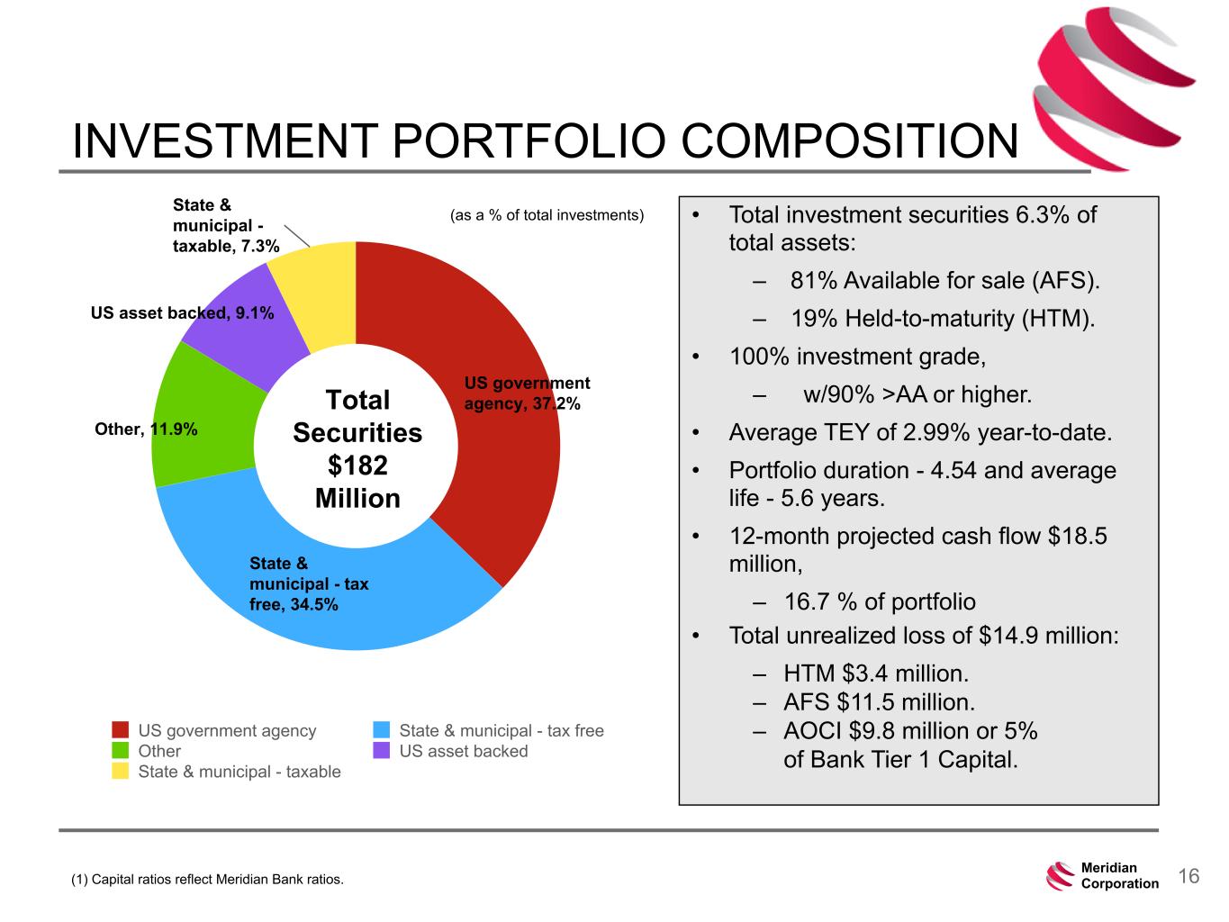 239 15 75 111 111 113 186 12 47 0 0 0 234 234 234 186 12 0 112 173 71 16Meridian Corporation INVESTMENT PORTFOLIO COMPOSITION • Total investment securities 6.3% of total assets: – 81% Available for sale (AFS). – 19% Held-to-maturity (HTM). • 100% investment grade, – w/90% >AA or higher. • Average TEY of 2.99% year-to-date. • Portfolio duration - 4.54 and average life - 5.6 years. • 12-month projected cash flow $18.5 million, – 16.7 % of portfolio • Total unrealized loss of $14.9 million: – HTM $3.4 million. – AFS $11.5 million. – AOCI $9.8 million or 5% of Bank Tier 1 Capital. (1) Capital ratios reflect Meridian Bank ratios. US government agency, 37.2% State & municipal - tax free, 34.5% Other, 11.9% US asset backed, 9.1% State & municipal - taxable, 7.3% US government agency State & municipal - tax free Other US asset backed State & municipal - taxable Total Securities $182 Million (as a % of total investments)