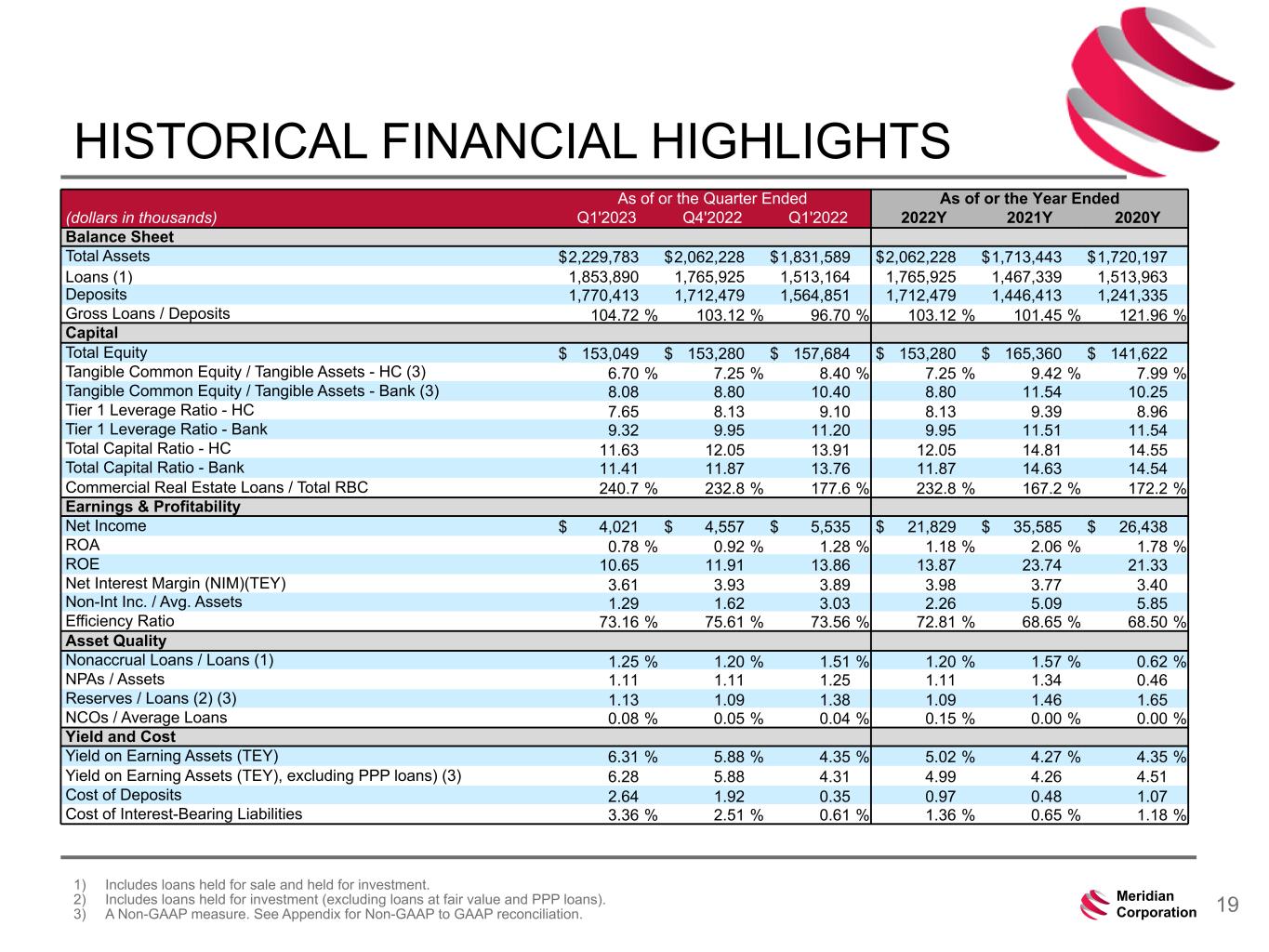 239 15 75 111 111 113 186 12 47 0 0 0 234 234 234 186 12 0 112 173 71 19Meridian Corporation HISTORICAL FINANCIAL HIGHLIGHTS 1) Includes loans held for sale and held for investment. 2) Includes loans held for investment (excluding loans at fair value and PPP loans). 3) A Non-GAAP measure. See Appendix for Non-GAAP to GAAP reconciliation. As of or the Quarter Ended As of or the Year Ended (dollars in thousands) Q1'2023 Q4'2022 Q1'2022 2022Y 2021Y 2020Y Balance Sheet Total Assets $ 2,229,783 $ 2,062,228 $ 1,831,589 $ 2,062,228 $ 1,713,443 $ 1,720,197 Loans (1) 1,853,890 1,765,925 1,513,164 1,765,925 1,467,339 1,513,963 Deposits 1,770,413 1,712,479 1,564,851 1,712,479 1,446,413 1,241,335 Gross Loans / Deposits 104.72 % 103.12 % 96.70 % 103.12 % 101.45 % 121.96 % Capital Total Equity $ 153,049 $ 153,280 $ 157,684 $ 153,280 $ 165,360 $ 141,622 Tangible Common Equity / Tangible Assets - HC (3) 6.70 % 7.25 % 8.40 % 7.25 % 9.42 % 7.99 % Tangible Common Equity / Tangible Assets - Bank (3) 8.08 8.80 10.40 8.80 11.54 10.25 Tier 1 Leverage Ratio - HC 7.65 8.13 9.10 8.13 9.39 8.96 Tier 1 Leverage Ratio - Bank 9.32 9.95 11.20 9.95 11.51 11.54 Total Capital Ratio - HC 11.63 12.05 13.91 12.05 14.81 14.55 Total Capital Ratio - Bank 11.41 11.87 13.76 11.87 14.63 14.54 Commercial Real Estate Loans / Total RBC 240.7 % 232.8 % 177.6 % 232.8 % 167.2 % 172.2 % Earnings & Profitability Net Income $ 4,021 $ 4,557 $ 5,535 $ 21,829 $ 35,585 $ 26,438 ROA 0.78 % 0.92 % 1.28 % 1.18 % 2.06 % 1.78 % ROE 10.65 11.91 13.86 13.87 23.74 21.33 Net Interest Margin (NIM)(TEY) 3.61 3.93 3.89 3.98 3.77 3.40 Non-Int Inc. / Avg. Assets 1.29 1.62 3.03 2.26 5.09 5.85 Efficiency Ratio 73.16 % 75.61 % 73.56 % 72.81 % 68.65 % 68.50 % Asset Quality Nonaccrual Loans / Loans (1) 1.25 % 1.20 % 1.51 % 1.20 % 1.57 % 0.62 % NPAs / Assets 1.11 1.11 1.25 1.11 1.34 0.46 Reserves / Loans (2) (3) 1.13 1.09 1.38 1.09 1.46 1.65 NCOs / Average Loans 0.08 % 0.05 % 0.04 % 0.15 % 0.00 % 0.00 % Yield and Cost Yield on Earning Assets (TEY) 6.31 % 5.88 % 4.35 % 5.02 % 4.27 % 4.35 % Yield on Earning Assets (TEY), excluding PPP loans) (3) 6.28 5.88 4.31 4.99 4.26 4.51 Cost of Deposits 2.64 1.92 0.35 0.97 0.48 1.07 Cost of Interest-Bearing Liabilities 3.36 % 2.51 % 0.61 % 1.36 % 0.65 % 1.18 %