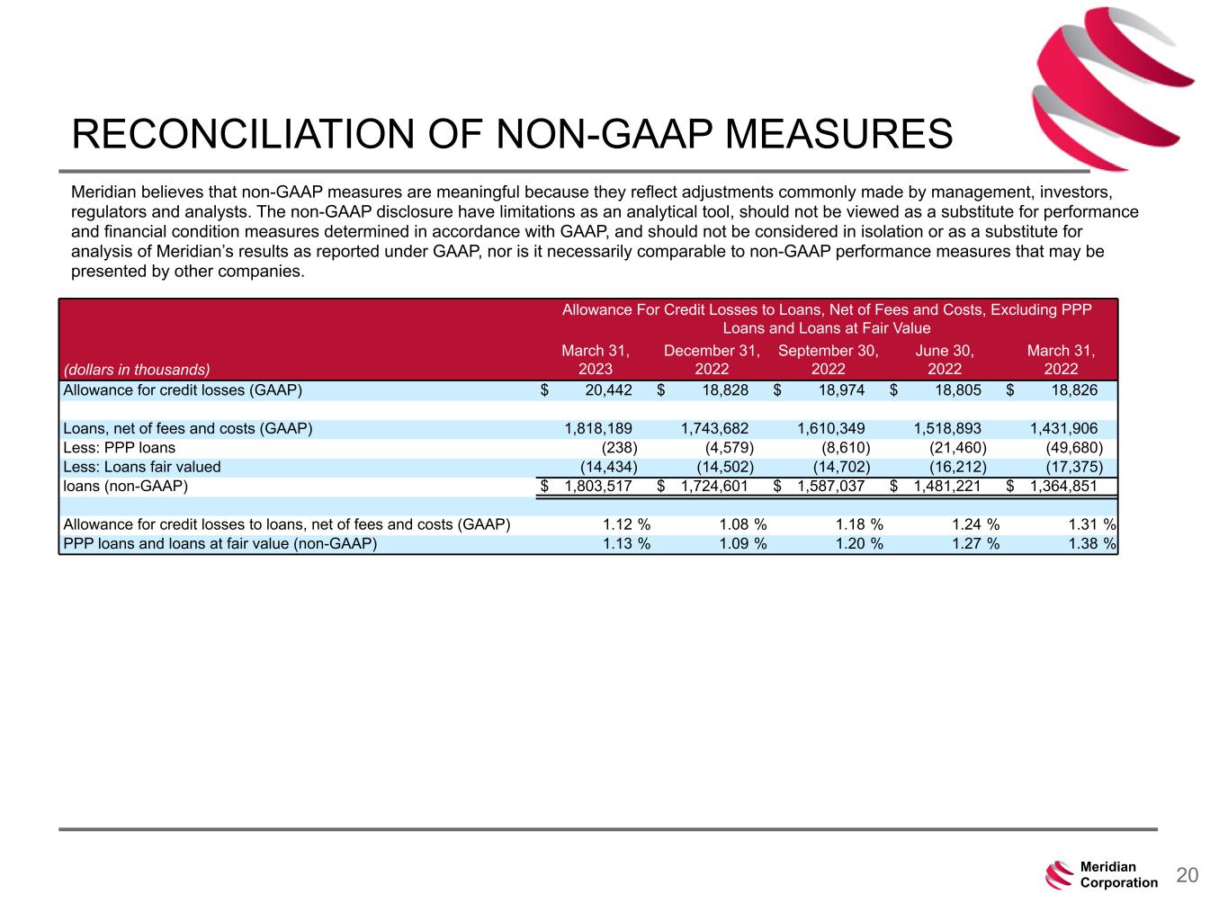 239 15 75 111 111 113 186 12 47 0 0 0 234 234 234 186 12 0 112 173 71 20Meridian Corporation Allowance For Credit Losses to Loans, Net of Fees and Costs, Excluding PPP Loans and Loans at Fair Value (dollars in thousands) March 31, 2023 December 31, 2022 September 30, 2022 June 30, 2022 March 31, 2022 Allowance for credit losses (GAAP) $ 20,442 $ 18,828 $ 18,974 $ 18,805 $ 18,826 Loans, net of fees and costs (GAAP) 1,818,189 1,743,682 1,610,349 1,518,893 1,431,906 Less: PPP loans (238) (4,579) (8,610) (21,460) (49,680) Less: Loans fair valued (14,434) (14,502) (14,702) (16,212) (17,375) loans (non-GAAP) $ 1,803,517 $ 1,724,601 $ 1,587,037 $ 1,481,221 $ 1,364,851 Allowance for credit losses to loans, net of fees and costs (GAAP) 1.12 % 1.08 % 1.18 % 1.24 % 1.31 % PPP loans and loans at fair value (non-GAAP) 1.13 % 1.09 % 1.20 % 1.27 % 1.38 % RECONCILIATION OF NON-GAAP MEASURES Meridian believes that non-GAAP measures are meaningful because they reflect adjustments commonly made by management, investors, regulators and analysts. The non-GAAP disclosure have limitations as an analytical tool, should not be viewed as a substitute for performance and financial condition measures determined in accordance with GAAP, and should not be considered in isolation or as a substitute for analysis of Meridian’s results as reported under GAAP, nor is it necessarily comparable to non-GAAP performance measures that may be presented by other companies.