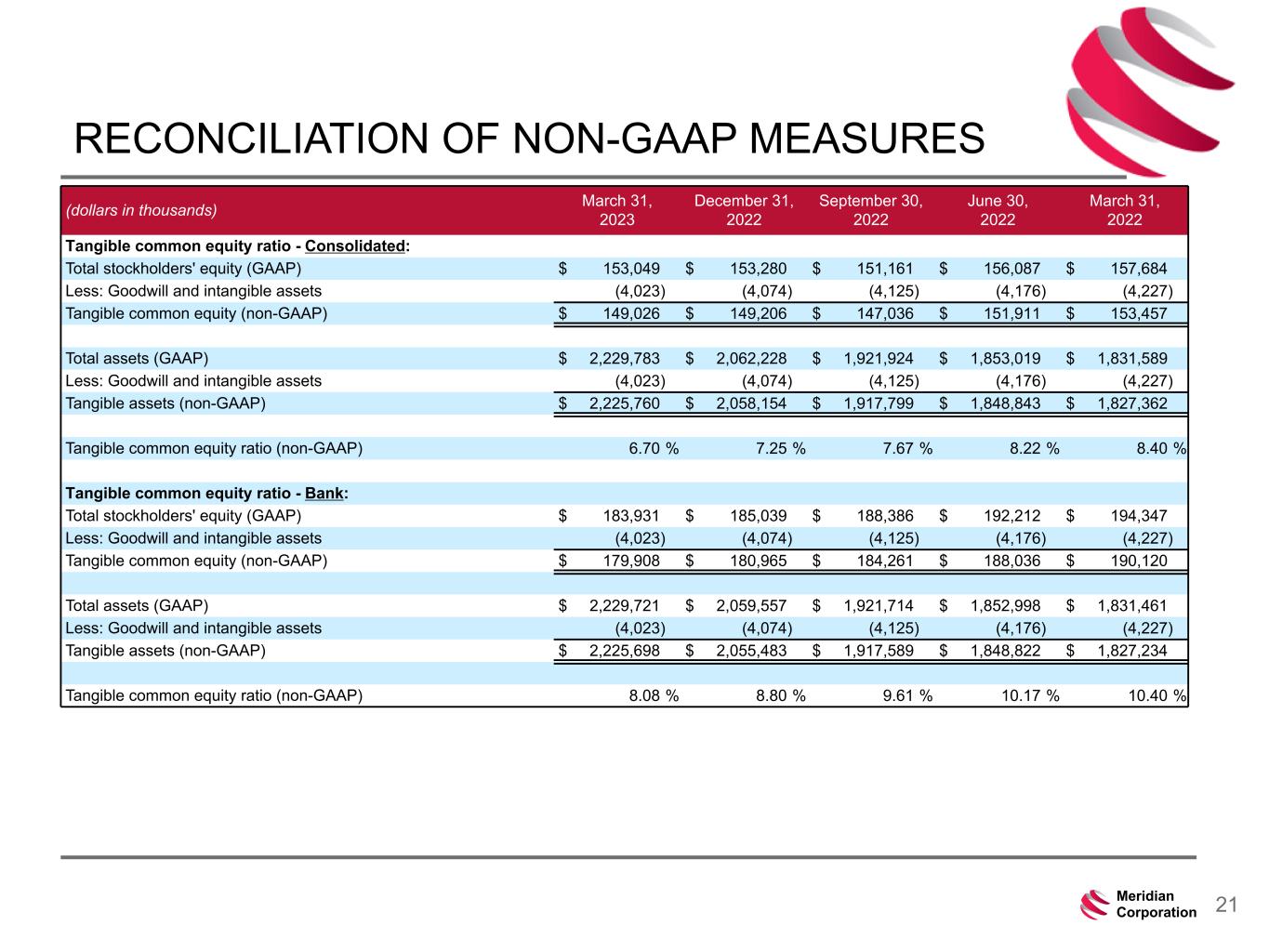 239 15 75 111 111 113 186 12 47 0 0 0 234 234 234 186 12 0 112 173 71 21Meridian Corporation (dollars in thousands) March 31, 2023 December 31, 2022 September 30, 2022 June 30, 2022 March 31, 2022 Tangible common equity ratio - Consolidated: Total stockholders' equity (GAAP) $ 153,049 $ 153,280 $ 151,161 $ 156,087 $ 157,684 Less: Goodwill and intangible assets (4,023) (4,074) (4,125) (4,176) (4,227) Tangible common equity (non-GAAP) $ 149,026 $ 149,206 $ 147,036 $ 151,911 $ 153,457 Total assets (GAAP) $ 2,229,783 $ 2,062,228 $ 1,921,924 $ 1,853,019 $ 1,831,589 Less: Goodwill and intangible assets (4,023) (4,074) (4,125) (4,176) (4,227) Tangible assets (non-GAAP) $ 2,225,760 $ 2,058,154 $ 1,917,799 $ 1,848,843 $ 1,827,362 Tangible common equity ratio (non-GAAP) 6.70 % 7.25 % 7.67 % 8.22 % 8.40 % Tangible common equity ratio - Bank: Total stockholders' equity (GAAP) $ 183,931 $ 185,039 $ 188,386 $ 192,212 $ 194,347 Less: Goodwill and intangible assets (4,023) (4,074) (4,125) (4,176) (4,227) Tangible common equity (non-GAAP) $ 179,908 $ 180,965 $ 184,261 $ 188,036 $ 190,120 Total assets (GAAP) $ 2,229,721 $ 2,059,557 $ 1,921,714 $ 1,852,998 $ 1,831,461 Less: Goodwill and intangible assets (4,023) (4,074) (4,125) (4,176) (4,227) Tangible assets (non-GAAP) $ 2,225,698 $ 2,055,483 $ 1,917,589 $ 1,848,822 $ 1,827,234 Tangible common equity ratio (non-GAAP) 8.08 % 8.80 % 9.61 % 10.17 % 10.40 % RECONCILIATION OF NON-GAAP MEASURES