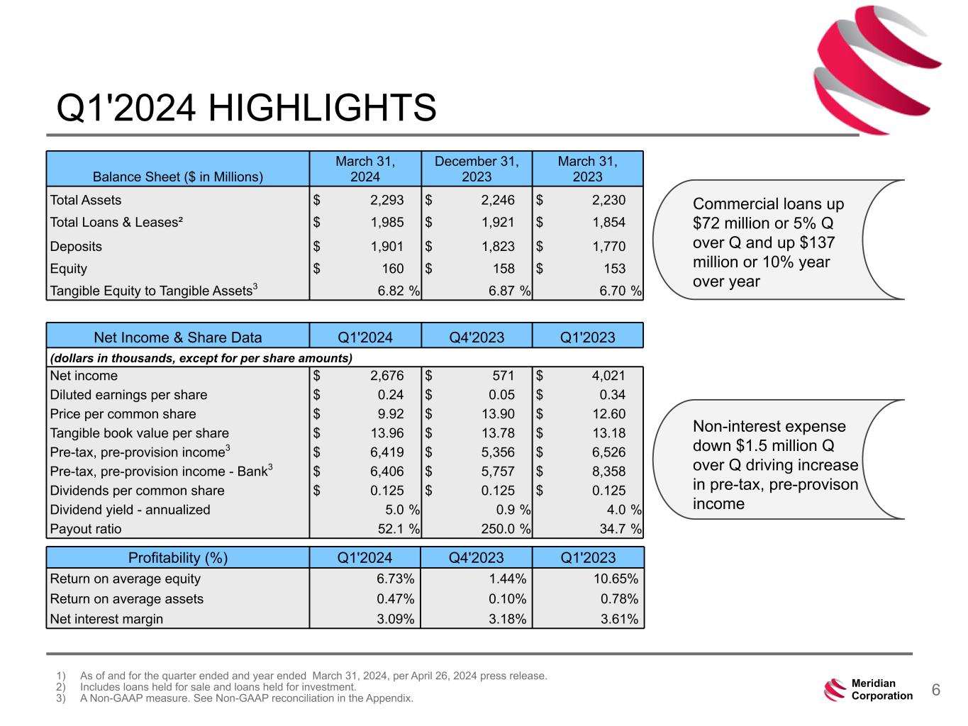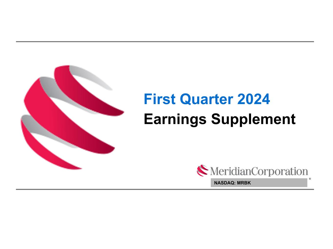 239 15 75 111 111 113 186 12 47 0 0 0 234 234 234 186 12 0 112 173 71 6Meridian Corporation Q1'2024 HIGHLIGHTS 1) As of and for the quarter ended and year ended March 31, 2024, per April 26, 2024 press release. 2) Includes loans held for sale and loans held for investment. 3) A Non-GAAP measure. See Non-GAAP reconciliation in the Appendix. Balance Sheet ($ in Millions) March 31, 2024 December 31, 2023 March 31, 2023 Total Assets $ 2,293 $ 2,246 $ 2,230 Total Loans & Leases² $ 1,985 $ 1,921 $ 1,854 Deposits $ 1,901 $ 1,823 $ 1,770 Equity $ 160 $ 158 $ 153 Tangible Equity to Tangible Assets3 6.82 % 6.87 % 6.70 % Profitability (%) Q1'2024 Q4'2023 Q1'2023 Return on average equity 6.73% 1.44% 10.65% Return on average assets 0.47% 0.10% 0.78% Net interest margin 3.09% 3.18% 3.61% Net Income & Share Data Q1'2024 Q4'2023 Q1'2023 (dollars in thousands, except for per share amounts) Net income $ 2,676 $ 571 $ 4,021 Diluted earnings per share $ 0.24 $ 0.05 $ 0.34 Price per common share $ 9.92 $ 13.90 $ 12.60 Tangible book value per share $ 13.96 $ 13.78 $ 13.18 Pre-tax, pre-provision income3 $ 6,419 $ 5,356 $ 6,526 Pre-tax, pre-provision income - Bank3 $ 6,406 $ 5,757 $ 8,358 Dividends per common share $ 0.125 $ 0.125 $ 0.125 Dividend yield - annualized 5.0 % 0.9 % 4.0 % Payout ratio 52.1 % 250.0 % 34.7 % Commercial loans up $72 million or 5% Q over Q and up $137 million or 10% year over year Non-interest expense down $1.5 million Q over Q driving increase in pre-tax, pre-provison income