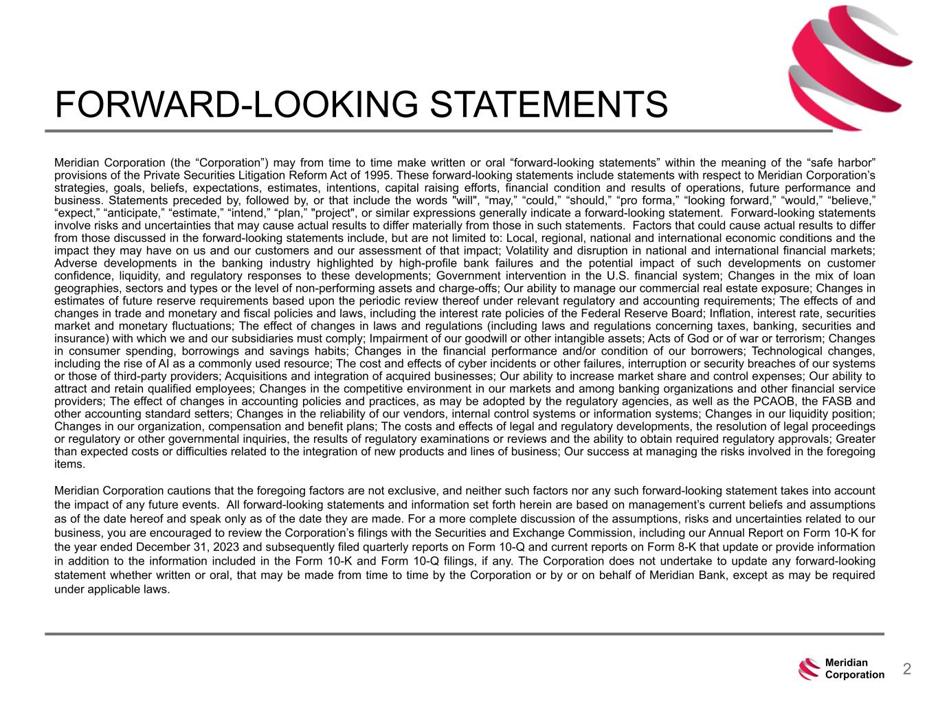 239 15 75 111 111 113 186 12 47 0 0 0 234 234 234 186 12 0 112 173 71 2Meridian Corporation FORWARD-LOOKING STATEMENTS Meridian Corporation (the “Corporation”) may from time to time make written or oral “forward-looking statements” within the meaning of the “safe harbor” provisions of the Private Securities Litigation Reform Act of 1995. These forward-looking statements include statements with respect to Meridian Corporation’s strategies, goals, beliefs, expectations, estimates, intentions, capital raising efforts, financial condition and results of operations, future performance and business. Statements preceded by, followed by, or that include the words "will", “may,” “could,” “should,” “pro forma,” “looking forward,” “would,” “believe,” “expect,” “anticipate,” “estimate,” “intend,” “plan,” "project", or similar expressions generally indicate a forward-looking statement. Forward-looking statements involve risks and uncertainties that may cause actual results to differ materially from those in such statements. Factors that could cause actual results to differ from those discussed in the forward-looking statements include, but are not limited to: Local, regional, national and international economic conditions and the impact they may have on us and our customers and our assessment of that impact; Volatility and disruption in national and international financial markets; Adverse developments in the banking industry highlighted by high-profile bank failures and the potential impact of such developments on customer confidence, liquidity, and regulatory responses to these developments; Government intervention in the U.S. financial system; Changes in the mix of loan geographies, sectors and types or the level of non-performing assets and charge-offs; Our ability to manage our commercial real estate exposure; Changes in estimates of future reserve requirements based upon the periodic review thereof under relevant regulatory and accounting requirements; The effects of and changes in trade and monetary and fiscal policies and laws, including the interest rate policies of the Federal Reserve Board; Inflation, interest rate, securities market and monetary fluctuations; The effect of changes in laws and regulations (including laws and regulations concerning taxes, banking, securities and insurance) with which we and our subsidiaries must comply; Impairment of our goodwill or other intangible assets; Acts of God or of war or terrorism; Changes in consumer spending, borrowings and savings habits; Changes in the financial performance and/or condition of our borrowers; Technological changes, including the rise of AI as a commonly used resource; The cost and effects of cyber incidents or other failures, interruption or security breaches of our systems or those of third-party providers; Acquisitions and integration of acquired businesses; Our ability to increase market share and control expenses; Our ability to attract and retain qualified employees; Changes in the competitive environment in our markets and among banking organizations and other financial service providers; The effect of changes in accounting policies and practices, as may be adopted by the regulatory agencies, as well as the PCAOB, the FASB and other accounting standard setters; Changes in the reliability of our vendors, internal control systems or information systems; Changes in our liquidity position; Changes in our organization, compensation and benefit plans; The costs and effects of legal and regulatory developments, the resolution of legal proceedings or regulatory or other governmental inquiries, the results of regulatory examinations or reviews and the ability to obtain required regulatory approvals; Greater than expected costs or difficulties related to the integration of new products and lines of business; Our success at managing the risks involved in the foregoing items. Meridian Corporation cautions that the foregoing factors are not exclusive, and neither such factors nor any such forward-looking statement takes into account the impact of any future events. All forward-looking statements and information set forth herein are based on management’s current beliefs and assumptions as of the date hereof and speak only as of the date they are made. For a more complete discussion of the assumptions, risks and uncertainties related to our business, you are encouraged to review the Corporation’s filings with the Securities and Exchange Commission, including our Annual Report on Form 10-K for the year ended December 31, 2023 and subsequently filed quarterly reports on Form 10-Q and current reports on Form 8-K that update or provide information in addition to the information included in the Form 10-K and Form 10-Q filings, if any. The Corporation does not undertake to update any forward-looking statement whether written or oral, that may be made from time to time by the Corporation or by or on behalf of Meridian Bank, except as may be required under applicable laws.