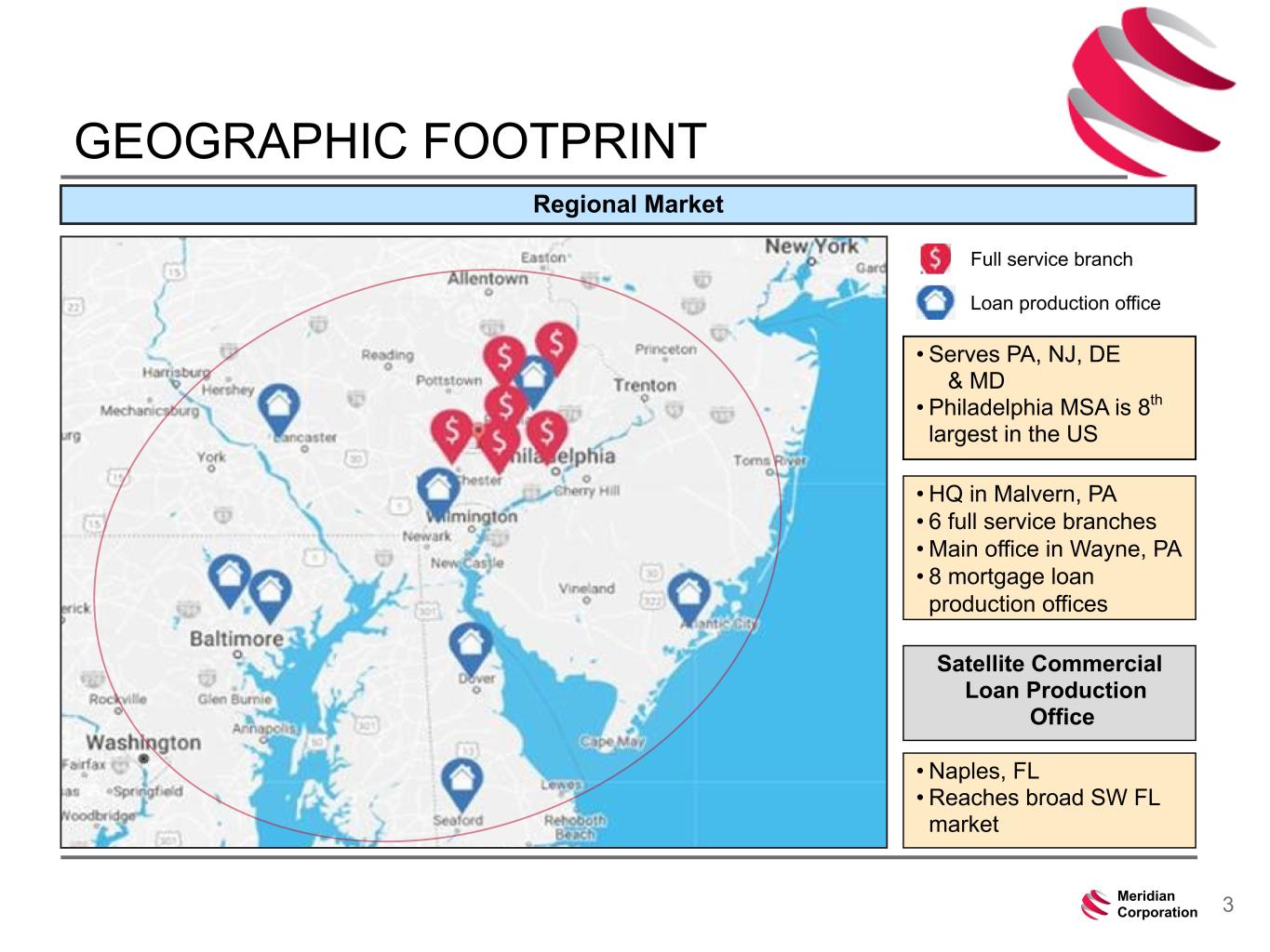 239 15 75 111 111 113 186 12 47 0 0 0 234 234 234 186 12 0 112 173 71 3Meridian Corporation GEOGRAPHIC FOOTPRINT Regional Market Full service branch Loan production office • Serves PA, NJ, DE & MD • Philadelphia MSA is 8th largest in the US • HQ in Malvern, PA • 6 full service branches • Main office in Wayne, PA • 8 mortgage loan production offices Satellite Commercial Loan Production Office • Naples, FL • Reaches broad SW FL market