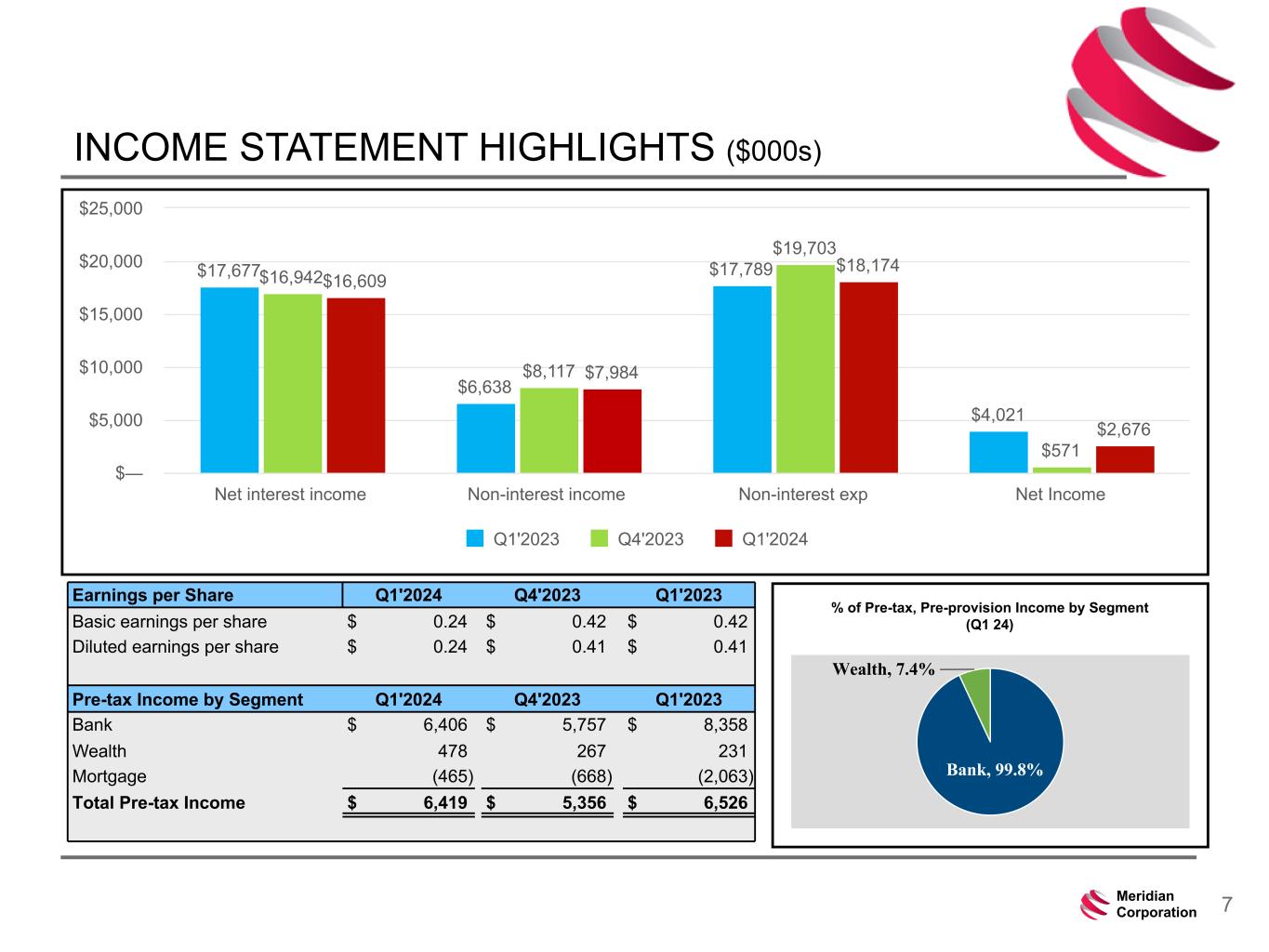 239 15 75 111 111 113 186 12 47 0 0 0 234 234 234 186 12 0 112 173 71 7Meridian Corporation INCOME STATEMENT HIGHLIGHTS ($000s) % of Pre-tax, Pre-provision Income by Segment (Q1 24) Bank, 99.8% Wealth, 7.4% $17,677 $6,638 $17,789 $4,021 $16,942 $8,117 $19,703 $571 $16,609 $7,984 $18,174 $2,676 Q1'2023 Q4'2023 Q1'2024 Net interest income Non-interest income Non-interest exp Net Income $— $5,000 $10,000 $15,000 $20,000 $25,000 Earnings per Share Q1'2024 Q4'2023 Q1'2023 Basic earnings per share $ 0.24 $ 0.42 $ 0.42 Diluted earnings per share $ 0.24 $ 0.41 $ 0.41 Pre-tax Income by Segment Q1'2024 Q4'2023 Q1'2023 Bank $ 6,406 $ 5,757 $ 8,358 Wealth 478 267 231 Mortgage (465) (668) (2,063) Total Pre-tax Income $ 6,419 $ 5,356 $ 6,526