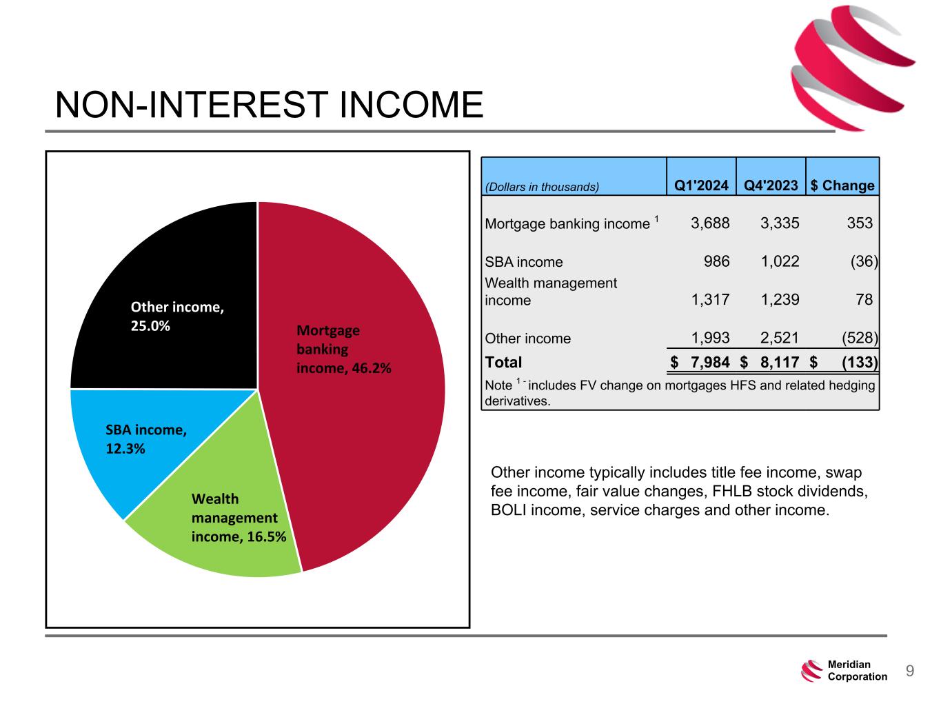 239 15 75 111 111 113 186 12 47 0 0 0 234 234 234 186 12 0 112 173 71 9Meridian Corporation NON-INTEREST INCOME (Dollars in thousands) Q1'2024 Q4'2023 $ Change Mortgage banking income 1 3,688 3,335 353 SBA income 986 1,022 (36) Wealth management income 1,317 1,239 78 Other income 1,993 2,521 (528) Total $ 7,984 $ 8,117 $ (133) Note 1 - includes FV change on mortgages HFS and related hedging derivatives. Mortgage banking income, 46.2% Wealth management income, 16.5% SBA income, 12.3% Other income, 25.0% Other income typically includes title fee income, swap fee income, fair value changes, FHLB stock dividends, BOLI income, service charges and other income.