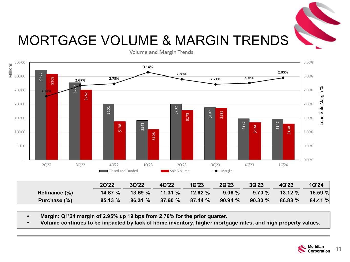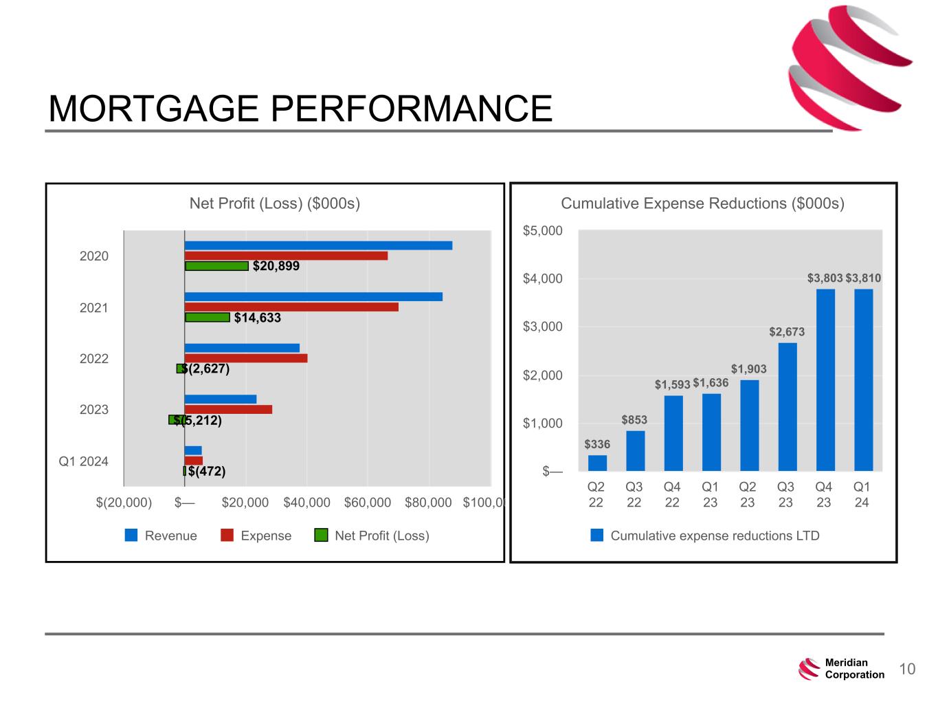 239 15 75 111 111 113 186 12 47 0 0 0 234 234 234 186 12 0 112 173 71 10Meridian Corporation MORTGAGE PERFORMANCE Net Profit (Loss) ($000s) $20,899 $14,633 $(2,627) $(5,212) $(472) Revenue Expense Net Profit (Loss) 2020 2021 2022 2023 Q1 2024 $(20,000) $— $20,000 $40,000 $60,000 $80,000 $100,000 Cumulative Expense Reductions ($000s) $336 $853 $1,593 $1,636 $1,903 $2,673 $3,803 $3,810 Cumulative expense reductions LTD Q2 22 Q3 22 Q4 22 Q1 23 Q2 23 Q3 23 Q4 23 Q1 24 $— $1,000 $2,000 $3,000 $4,000 $5,000