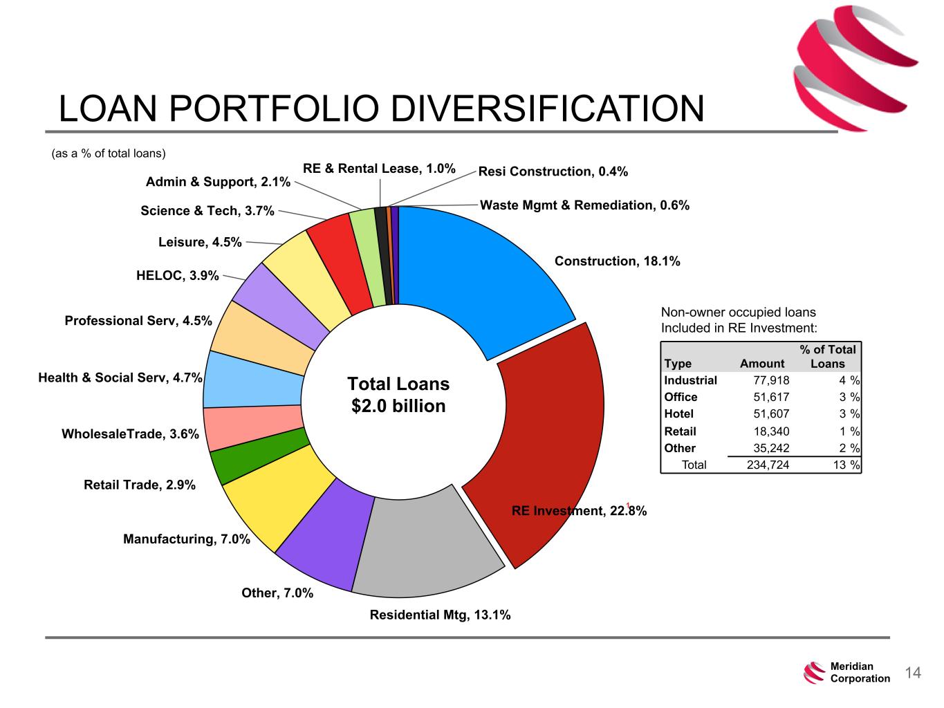 239 15 75 111 111 113 186 12 47 0 0 0 234 234 234 186 12 0 112 173 71 14Meridian Corporation Construction, 18.1% RE Investment, 22.8% Residential Mtg, 13.1% Other, 7.0% Manufacturing, 7.0% Retail Trade, 2.9% WholesaleTrade, 3.6% Health & Social Serv, 4.7% Professional Serv, 4.5% HELOC, 3.9% Leisure, 4.5% Science & Tech, 3.7% Admin & Support, 2.1% RE & Rental Lease, 1.0% Resi Construction, 0.4% Waste Mgmt & Remediation, 0.6% LOAN PORTFOLIO DIVERSIFICATION Total Loans $2.0 billion 1 (as a % of total loans) Type Amount % of Total Loans Industrial 77,918 4 % Office 51,617 3 % Hotel 51,607 3 % Retail 18,340 1 % Other 35,242 2 % Total 234,724 13 % Non-owner occupied loans Included in RE Investment: