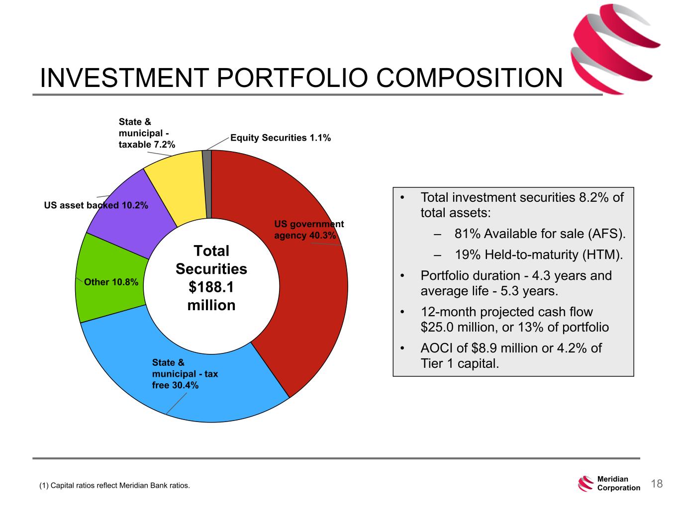 239 15 75 111 111 113 186 12 47 0 0 0 234 234 234 186 12 0 112 173 71 18Meridian Corporation INVESTMENT PORTFOLIO COMPOSITION • Total investment securities 8.2% of total assets: – 81% Available for sale (AFS). – 19% Held-to-maturity (HTM). • Portfolio duration - 4.3 years and average life - 5.3 years. • 12-month projected cash flow $25.0 million, or 13% of portfolio • AOCI of $8.9 million or 4.2% of Tier 1 capital. (1) Capital ratios reflect Meridian Bank ratios. US government agency 40.3% State & municipal - tax free 30.4% Other 10.8% US asset backed 10.2% State & municipal - taxable 7.2% Equity Securities 1.1% Total Securities $188.1 million