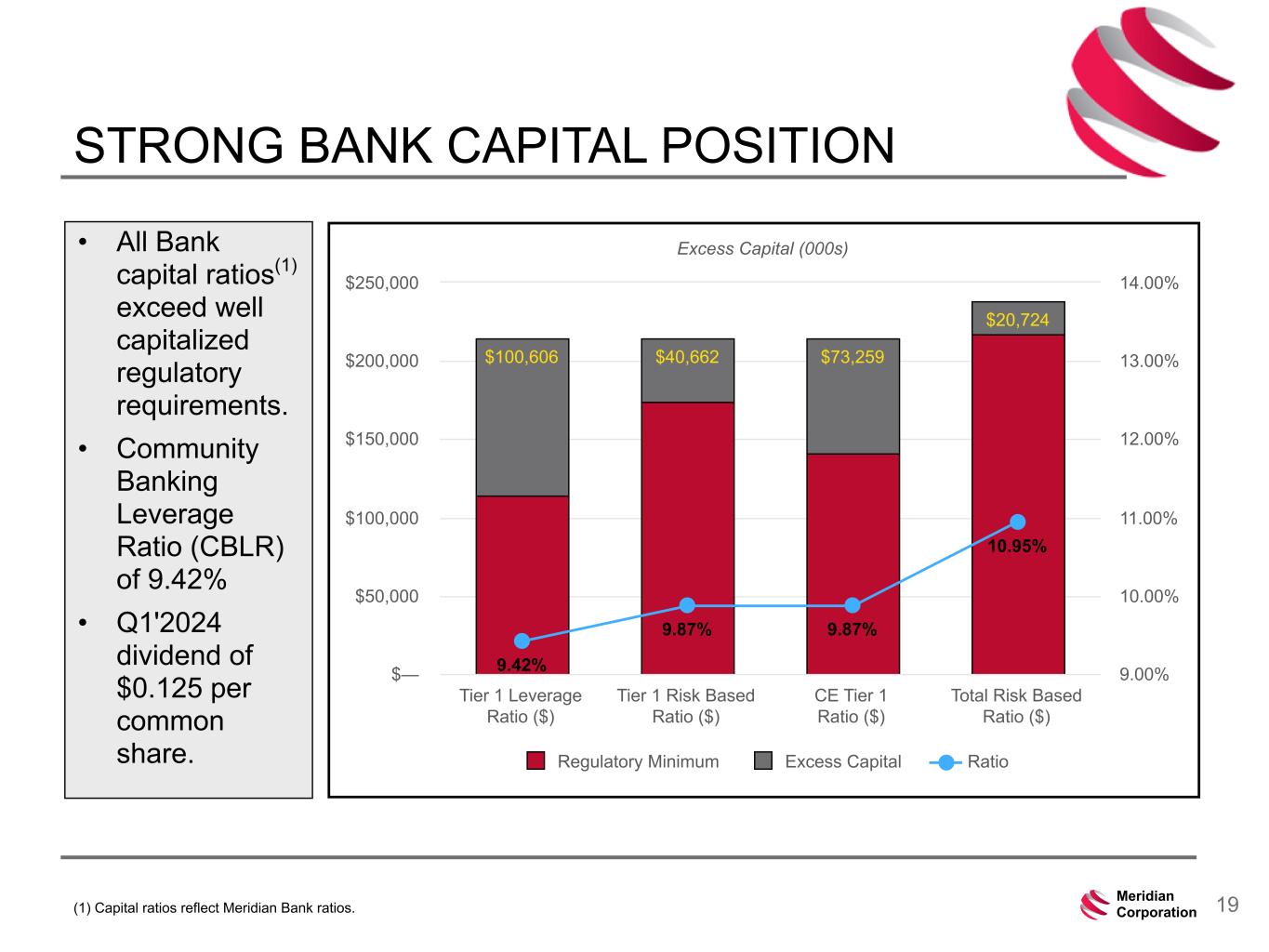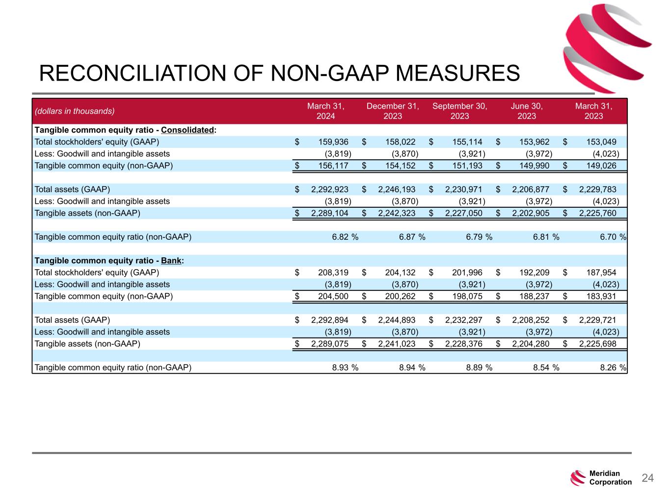 239 15 75 111 111 113 186 12 47 0 0 0 234 234 234 186 12 0 112 173 71 24Meridian Corporation (dollars in thousands) March 31, 2024 December 31, 2023 September 30, 2023 June 30, 2023 March 31, 2023 Tangible common equity ratio - Consolidated: Total stockholders' equity (GAAP) $ 159,936 $ 158,022 $ 155,114 $ 153,962 $ 153,049 Less: Goodwill and intangible assets (3,819) (3,870) (3,921) (3,972) (4,023) Tangible common equity (non-GAAP) $ 156,117 $ 154,152 $ 151,193 $ 149,990 $ 149,026 Total assets (GAAP) $ 2,292,923 $ 2,246,193 $ 2,230,971 $ 2,206,877 $ 2,229,783 Less: Goodwill and intangible assets (3,819) (3,870) (3,921) (3,972) (4,023) Tangible assets (non-GAAP) $ 2,289,104 $ 2,242,323 $ 2,227,050 $ 2,202,905 $ 2,225,760 Tangible common equity ratio (non-GAAP) 6.82 % 6.87 % 6.79 % 6.81 % 6.70 % Tangible common equity ratio - Bank: Total stockholders' equity (GAAP) $ 208,319 $ 204,132 $ 201,996 $ 192,209 $ 187,954 Less: Goodwill and intangible assets (3,819) (3,870) (3,921) (3,972) (4,023) Tangible common equity (non-GAAP) $ 204,500 $ 200,262 $ 198,075 $ 188,237 $ 183,931 Total assets (GAAP) $ 2,292,894 $ 2,244,893 $ 2,232,297 $ 2,208,252 $ 2,229,721 Less: Goodwill and intangible assets (3,819) (3,870) (3,921) (3,972) (4,023) Tangible assets (non-GAAP) $ 2,289,075 $ 2,241,023 $ 2,228,376 $ 2,204,280 $ 2,225,698 Tangible common equity ratio (non-GAAP) 8.93 % 8.94 % 8.89 % 8.54 % 8.26 % RECONCILIATION OF NON-GAAP MEASURES