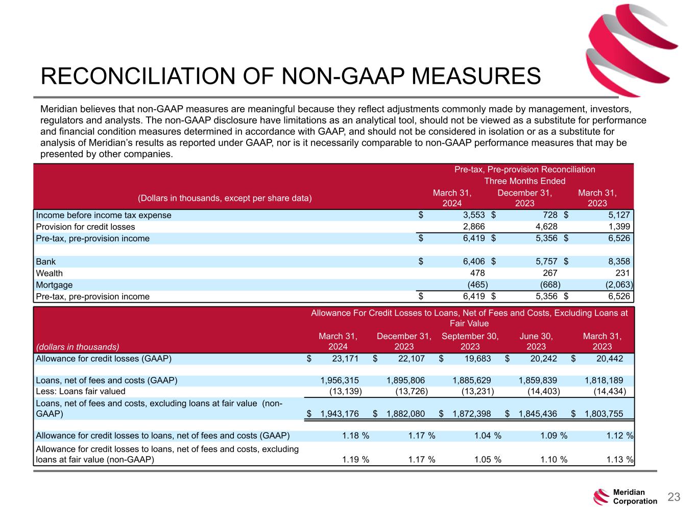 239 15 75 111 111 113 186 12 47 0 0 0 234 234 234 186 12 0 112 173 71 23Meridian Corporation Allowance For Credit Losses to Loans, Net of Fees and Costs, Excluding Loans at Fair Value (dollars in thousands) March 31, 2024 December 31, 2023 September 30, 2023 June 30, 2023 March 31, 2023 Allowance for credit losses (GAAP) $ 23,171 $ 22,107 $ 19,683 $ 20,242 $ 20,442 Loans, net of fees and costs (GAAP) 1,956,315 1,895,806 1,885,629 1,859,839 1,818,189 Less: Loans fair valued (13,139) (13,726) (13,231) (14,403) (14,434) Loans, net of fees and costs, excluding loans at fair value (non- GAAP) $ 1,943,176 $ 1,882,080 $ 1,872,398 $ 1,845,436 $ 1,803,755 Allowance for credit losses to loans, net of fees and costs (GAAP) 1.18 % 1.17 % 1.04 % 1.09 % 1.12 % Allowance for credit losses to loans, net of fees and costs, excluding loans at fair value (non-GAAP) 1.19 % 1.17 % 1.05 % 1.10 % 1.13 % RECONCILIATION OF NON-GAAP MEASURES Meridian believes that non-GAAP measures are meaningful because they reflect adjustments commonly made by management, investors, regulators and analysts. The non-GAAP disclosure have limitations as an analytical tool, should not be viewed as a substitute for performance and financial condition measures determined in accordance with GAAP, and should not be considered in isolation or as a substitute for analysis of Meridian’s results as reported under GAAP, nor is it necessarily comparable to non-GAAP performance measures that may be presented by other companies. Pre-tax, Pre-provision Reconciliation Three Months Ended (Dollars in thousands, except per share data) March 31, 2024 December 31, 2023 March 31, 2023 Income before income tax expense $ 3,553 $ 728 $ 5,127 Provision for credit losses 2,866 4,628 1,399 Pre-tax, pre-provision income $ 6,419 $ 5,356 $ 6,526 Bank $ 6,406 $ 5,757 $ 8,358 Wealth 478 267 231 Mortgage (465) (668) (2,063) Pre-tax, pre-provision income $ 6,419 $ 5,356 $ 6,526