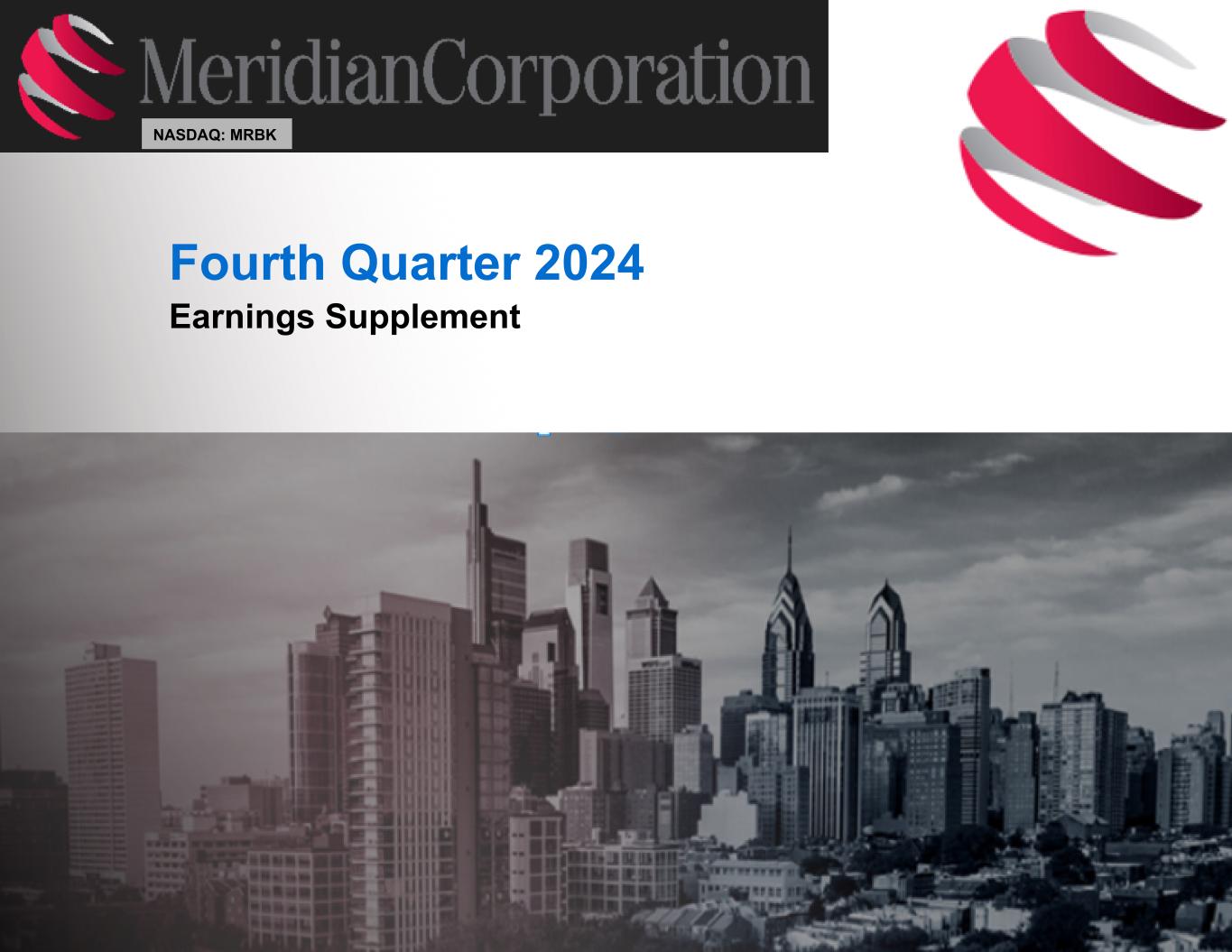 239 15 75 111 111 113 186 12 47 0 0 0 234 234 234 186 12 0 112 173 71 2Meridian Corporation FORWARD-LOOKING STATEMENTS Meridian Corporation (the “Corporation”) may from time to time make written or oral “forward-looking statements” within the meaning of the “safe harbor” provisions of the Private Securities Litigation Reform Act of 1995. These forward-looking statements include statements with respect to Meridian Corporation’s strategies, goals, beliefs, expectations, estimates, intentions, capital raising efforts, financial condition and results of operations, future performance and business. Statements preceded by, followed by, or that include the words "will", “may,” “could,” “should,” “pro forma,” “looking forward,” “would,” “believe,” “expect,” “anticipate,” “estimate,” “intend,” “plan,” "project", or similar expressions generally indicate a forward-looking statement. Forward-looking statements involve risks and uncertainties that may cause actual results to differ materially from those in such statements. Factors that could cause actual results to differ from those discussed in the forward-looking statements include, but are not limited to: Local, regional, national and international economic conditions and the impact they may have on us and our customers and our assessment of that impact; Volatility and disruption in national and international financial markets; Adverse developments in the banking industry highlighted by high-profile bank failures and the potential impact of such developments on customer confidence, liquidity, and regulatory responses to these developments; Government intervention in the U.S. financial system; Changes in the mix of loan geographies, sectors and types or the level of non-performing assets and charge-offs; Our ability to manage our commercial real estate exposure; Changes in estimates of future reserve requirements based upon the periodic review thereof under relevant regulatory and accounting requirements; The effects of and changes in trade and monetary and fiscal policies and laws, including the interest rate policies of the Federal Reserve Board; Inflation, interest rate, securities market and monetary fluctuations; The effect of changes in laws and regulations (including laws and regulations concerning taxes, banking, securities and insurance) with which we and our subsidiaries must comply; Impairment of our goodwill or other intangible assets; Acts of God or of war or terrorism; Changes in consumer spending, borrowings and savings habits; Changes in the financial performance and/or condition of our borrowers; Technological changes, including the rise of AI as a commonly used resource; The cost and effects of cyber incidents or other failures, interruption or security breaches of our systems or those of third-party providers; Acquisitions and integration of acquired businesses; Our ability to increase market share and control expenses; Our ability to attract and retain qualified employees; Changes in the competitive environment in our markets and among banking organizations and other financial service providers; The effect of changes in accounting policies and practices, as may be adopted by the regulatory agencies, as well as the PCAOB, the FASB and other accounting standard setters; Changes in the reliability of our vendors, internal control systems or information systems; Changes in our liquidity position; Changes in our organization, compensation and benefit plans; The costs and effects of legal and regulatory developments, the resolution of legal proceedings or regulatory or other governmental inquiries, the results of regulatory examinations or reviews and the ability to obtain required regulatory approvals; Greater than expected costs or difficulties related to the integration of new products and lines of business; Our success at managing the risks involved in the foregoing items. Meridian Corporation cautions that the foregoing factors are not exclusive, and neither such factors nor any such forward-looking statement takes into account the impact of any future events. All forward-looking statements and information set forth herein are based on management’s current beliefs and assumptions as of the date hereof and speak only as of the date they are made. For a more complete discussion of the assumptions, risks and uncertainties related to our business, you are encouraged to review the Corporation’s filings with the Securities and Exchange Commission, including our Annual Report on Form 10-K for the year ended December 31, 2023 and subsequently filed quarterly reports on Form 10-Q and current reports on Form 8-K that update or provide information in addition to the information included in the Form 10-K and Form 10-Q filings, if any. The Corporation does not undertake to update any forward-looking statement whether written or oral, that may be made from time to time by the Corporation or by or on behalf of Meridian Bank, except as may be required under applicable laws.