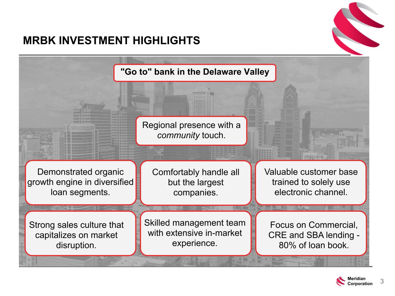 239 15 75 111 111 113 186 12 47 0 0 0 234 234 234 186 12 0 112 173 71 3Meridian Corporation MRBK INVESTMENT HIGHLIGHTS "Go to" bank in the Delaware Valley Valuable customer base trained to solely use electronic channel. Regional presence with a community touch. Focus on Commercial, CRE and SBA lending - 80% of loan book. Comfortably handle all but the largest companies. Skilled management team with extensive in-market experience. Demonstrated organic growth engine in diversified loan segments. Strong sales culture that capitalizes on market disruption.