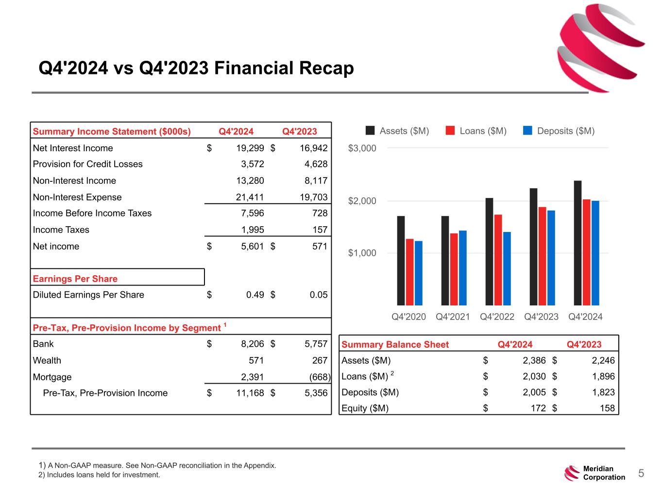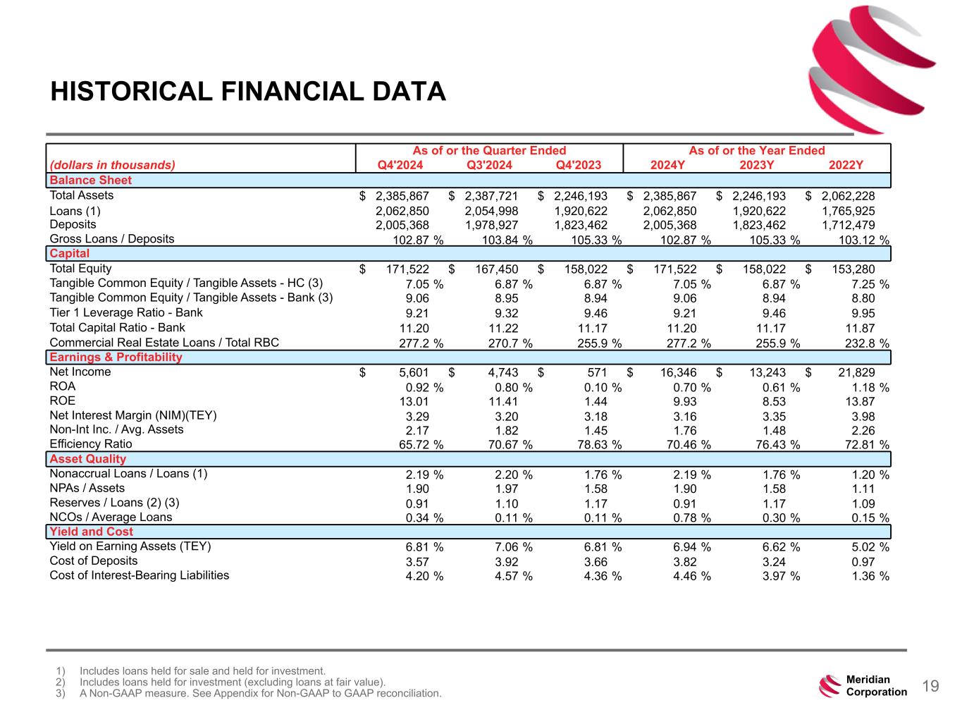 239 15 75 111 111 113 186 12 47 0 0 0 234 234 234 186 12 0 112 173 71 19Meridian Corporation HISTORICAL FINANCIAL DATA 1) Includes loans held for sale and held for investment. 2) Includes loans held for investment (excluding loans at fair value). 3) A Non-GAAP measure. See Appendix for Non-GAAP to GAAP reconciliation. As of or the Quarter Ended As of or the Year Ended (dollars in thousands) Q4'2024 Q3'2024 Q4'2023 2024Y 2023Y 2022Y Balance Sheet Total Assets $ 2,385,867 $ 2,387,721 $ 2,246,193 $ 2,385,867 $ 2,246,193 $ 2,062,228 Loans (1) 2,062,850 2,054,998 1,920,622 2,062,850 1,920,622 1,765,925 Deposits 2,005,368 1,978,927 1,823,462 2,005,368 1,823,462 1,712,479 Gross Loans / Deposits 102.87 % 103.84 % 105.33 % 102.87 % 105.33 % 103.12 % Capital Total Equity $ 171,522 $ 167,450 $ 158,022 $ 171,522 $ 158,022 $ 153,280 Tangible Common Equity / Tangible Assets - HC (3) 7.05 % 6.87 % 6.87 % 7.05 % 6.87 % 7.25 % Tangible Common Equity / Tangible Assets - Bank (3) 9.06 8.95 8.94 9.06 8.94 8.80 Tier 1 Leverage Ratio - Bank 9.21 9.32 9.46 9.21 9.46 9.95 Total Capital Ratio - Bank 11.20 11.22 11.17 11.20 11.17 11.87 Commercial Real Estate Loans / Total RBC 277.2 % 270.7 % 255.9 % 277.2 % 255.9 % 232.8 % Earnings & Profitability Net Income $ 5,601 $ 4,743 $ 571 $ 16,346 $ 13,243 $ 21,829 ROA 0.92 % 0.80 % 0.10 % 0.70 % 0.61 % 1.18 % ROE 13.01 11.41 1.44 9.93 8.53 13.87 Net Interest Margin (NIM)(TEY) 3.29 3.20 3.18 3.16 3.35 3.98 Non-Int Inc. / Avg. Assets 2.17 1.82 1.45 1.76 1.48 2.26 Efficiency Ratio 65.72 % 70.67 % 78.63 % 70.46 % 76.43 % 72.81 % Asset Quality Nonaccrual Loans / Loans (1) 2.19 % 2.20 % 1.76 % 2.19 % 1.76 % 1.20 % NPAs / Assets 1.90 1.97 1.58 1.90 1.58 1.11 Reserves / Loans (2) (3) 0.91 1.10 1.17 0.91 1.17 1.09 NCOs / Average Loans 0.34 % 0.11 % 0.11 % 0.78 % 0.30 % 0.15 % Yield and Cost Yield on Earning Assets (TEY) 6.81 % 7.06 % 6.81 % 6.94 % 6.62 % 5.02 % Cost of Deposits 3.57 3.92 3.66 3.82 3.24 0.97 Cost of Interest-Bearing Liabilities 4.20 % 4.57 % 4.36 % 4.46 % 3.97 % 1.36 %