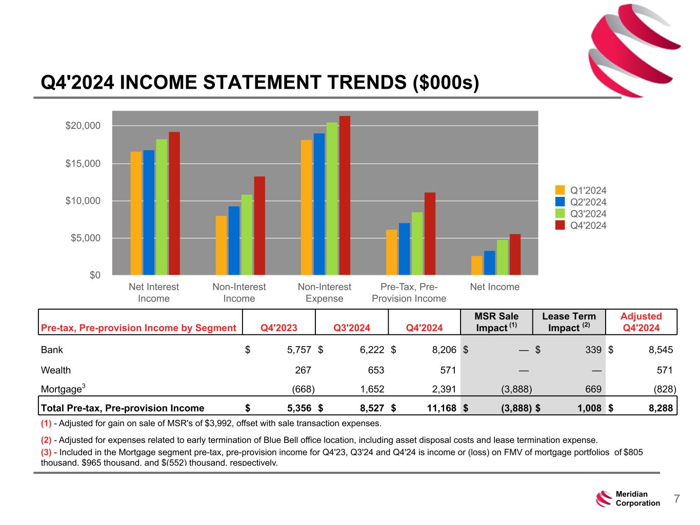 239 15 75 111 111 113 186 12 47 0 0 0 234 234 234 186 12 0 112 173 71 6Meridian Corporation Q4'2024 HIGHLIGHTS 1) As of and for the quarter ended and year ended December 31, 2024, per January 24, 2025 press release. 2) Includes loans held for sale and loans held for investment. 3) A Non-GAAP measure. See Non-GAAP reconciliation in the Appendix. For the Calendar Quarter Ended Balance Sheet ($M) Q4'2024 Q3'2024 Q2'2024 Q1'2024 Q4'2023 Total Assets $ 2,386 $ 2,388 $ 2,352 $ 2,293 $ 2,246 Total Loans & Leases² 2,063 2,055 2,043 1,985 1,921 Deposits 2,005 1,979 1,915 1,901 1,823 Equity 172 167 162 160 158 Tangible Equity / Tangible Assets3 7.05 % 6.87 % 6.76 % 6.82 % 6.87 % Net Income & Share Data ($000s) Net Income $ 5,601 $ 4,743 $ 3,326 $ 2,676 $ 571 Diluted EPS 0.49 0.42 0.30 0.24 0.05 Price per Common Share 13.71 12.64 10.52 9.92 13.90 TBV per Share 14.93 14.58 14.17 13.96 13.78 Pre-tax, Pre-Provision Income3 11,168 8,527 7,072 6,419 5,356 Common Dividends per Share 0.125 0.125 0.125 0.125 0.125 Dividend Yield (annualized) 3.6 % 4.0 % 4.8 % 5.0 % 3.6 % Payout Ratio 25.0 % 29.1 % 41.7 % 52.1 % 250.0 % Profitability (%) ROAA 0.92 % 0.80 % 0.58 % 0.47 % 0.10 % ROAE 13.01 % 11.41 % 8.25 % 6.73 % 1.44 % NIM 3.29 % 3.20 % 3.06 % 3.09 % 3.18 %