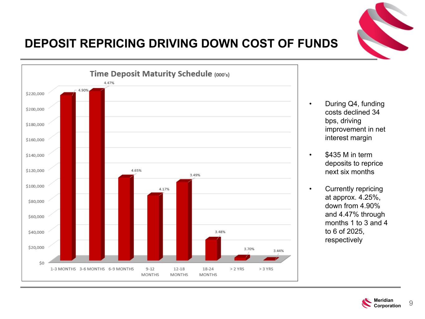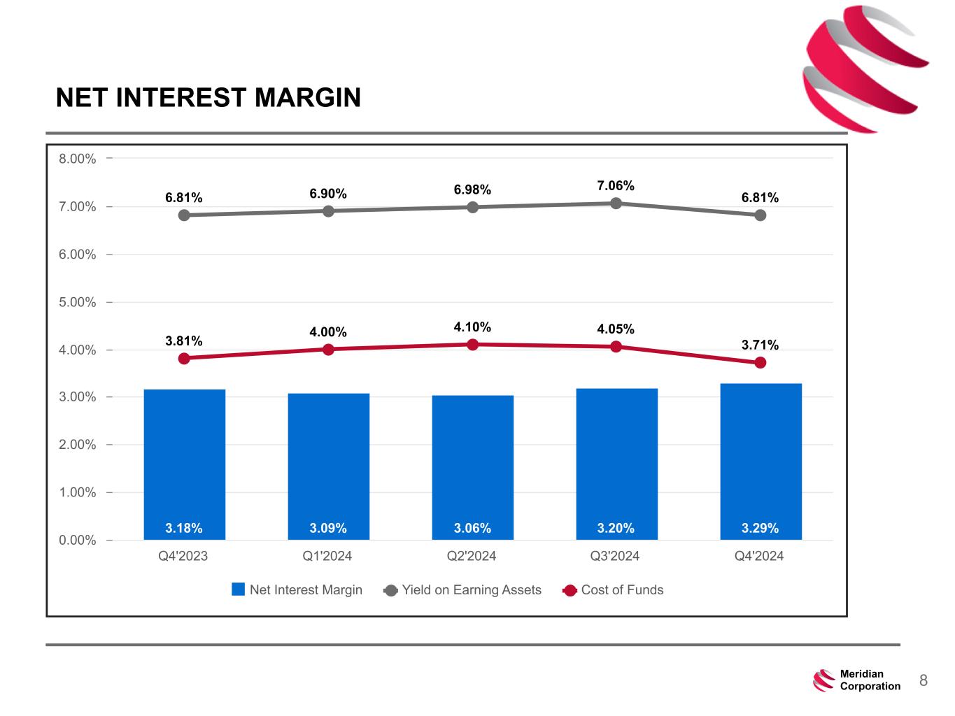 239 15 75 111 111 113 186 12 47 0 0 0 234 234 234 186 12 0 112 173 71 8Meridian Corporation NET INTEREST MARGIN 3.18% 3.09% 3.06% 3.20% 3.29% 6.81% 6.90% 6.98% 7.06% 6.81% 3.81% 4.00% 4.10% 4.05% 3.71% Net Interest Margin Yield on Earning Assets Cost of Funds Q4'2023 Q1'2024 Q2'2024 Q3'2024 Q4'2024 0.00% 1.00% 2.00% 3.00% 4.00% 5.00% 6.00% 7.00% 8.00%