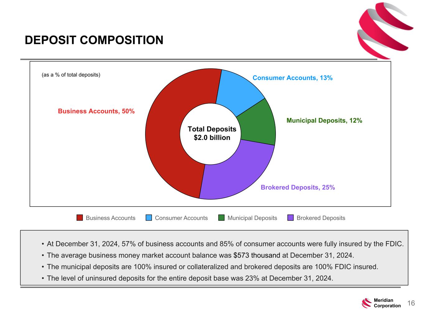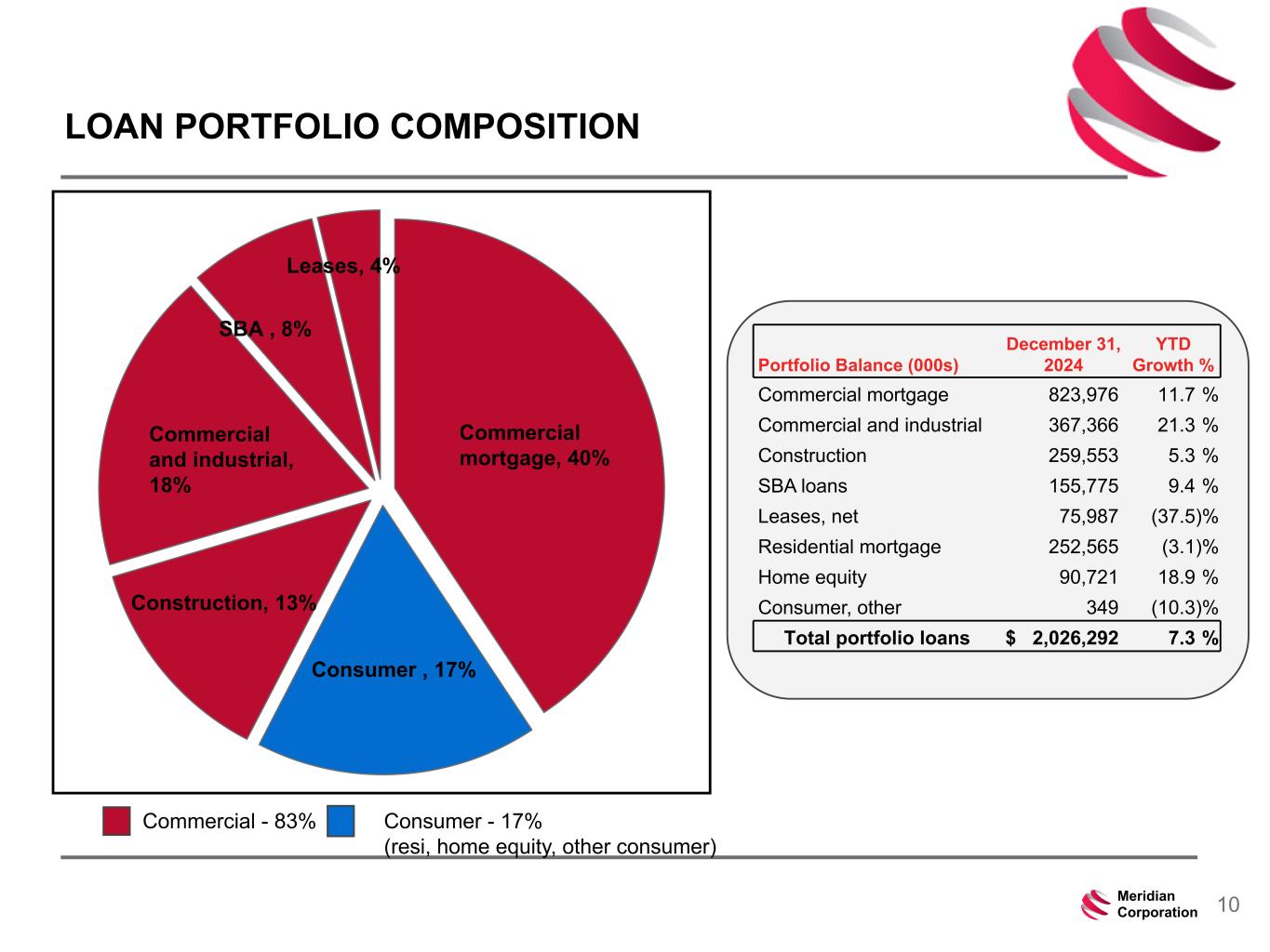 239 15 75 111 111 113 186 12 47 0 0 0 234 234 234 186 12 0 112 173 71 10Meridian Corporation LOAN PORTFOLIO COMPOSITION Portfolio Balance (000s) December 31, 2024 YTD Growth % Commercial mortgage 823,976 11.7 % Commercial and industrial 367,366 21.3 % Construction 259,553 5.3 % SBA loans 155,775 9.4 % Leases, net 75,987 (37.5) % Residential mortgage 252,565 (3.1) % Home equity 90,721 18.9 % Consumer, other 349 (10.3) % Total portfolio loans $ 2,026,292 7.3 % Commercial mortgage, 40% Consumer , 17% Construction, 13% Commercial and industrial, 18% SBA , 8% Leases, 4% Commercial - 83% Consumer - 17% (resi, home equity, other consumer)