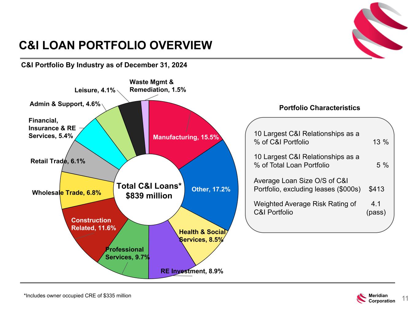 239 15 75 111 111 113 186 12 47 0 0 0 234 234 234 186 12 0 112 173 71 11Meridian Corporation C&I LOAN PORTFOLIO OVERVIEW C&I Portfolio By Industry as of December 31, 2024 10 Largest C&I Relationships as a % of C&I Portfolio 13 % 10 Largest C&I Relationships as a % of Total Loan Portfolio 5 % Average Loan Size O/S of C&I Portfolio, excluding leases ($000s) $413 Weighted Average Risk Rating of C&I Portfolio 4.1 (pass) Manufacturing, 15.5% Other, 17.2% Health & Social Services, 8.5% RE Investment, 8.9% Professional Services, 9.7% Construction Related, 11.6% Wholesale Trade, 6.8% Retail Trade, 6.1% Financial, Insurance & RE Services, 5.4% Admin & Support, 4.6% Leisure, 4.1% Waste Mgmt & Remediation, 1.5% Total C&I Loans* $839 million *Includes owner occupied CRE of $335 million Portfolio Characteristics