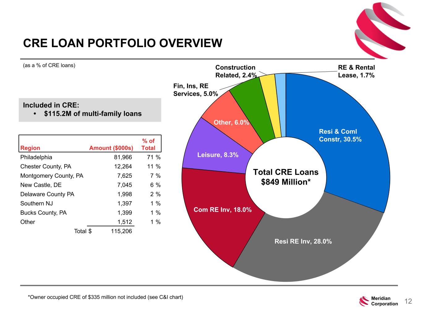239 15 75 111 111 113 186 12 47 0 0 0 234 234 234 186 12 0 112 173 71 12Meridian Corporation Resi & Coml Constr, 30.5% Resi RE Inv, 28.0% Com RE Inv, 18.0% Leisure, 8.3% Other, 6.0% Fin, Ins, RE Services, 5.0% Construction Related, 2.4% RE & Rental Lease, 1.7% CRE LOAN PORTFOLIO OVERVIEW Total CRE Loans $849 Million* (as a % of CRE loans) *Owner occupied CRE of $335 million not included (see C&I chart) Included in CRE: • $115.2M of multi-family loans Region Amount ($000s) % of Total Philadelphia 81,966 71 % Chester County, PA 12,264 11 % Montgomery County, PA 7,625 7 % New Castle, DE 7,045 6 % Delaware County PA 1,998 2 % Southern NJ 1,397 1 % Bucks County, PA 1,399 1 % Other 1,512 1 % Total $ 115,206