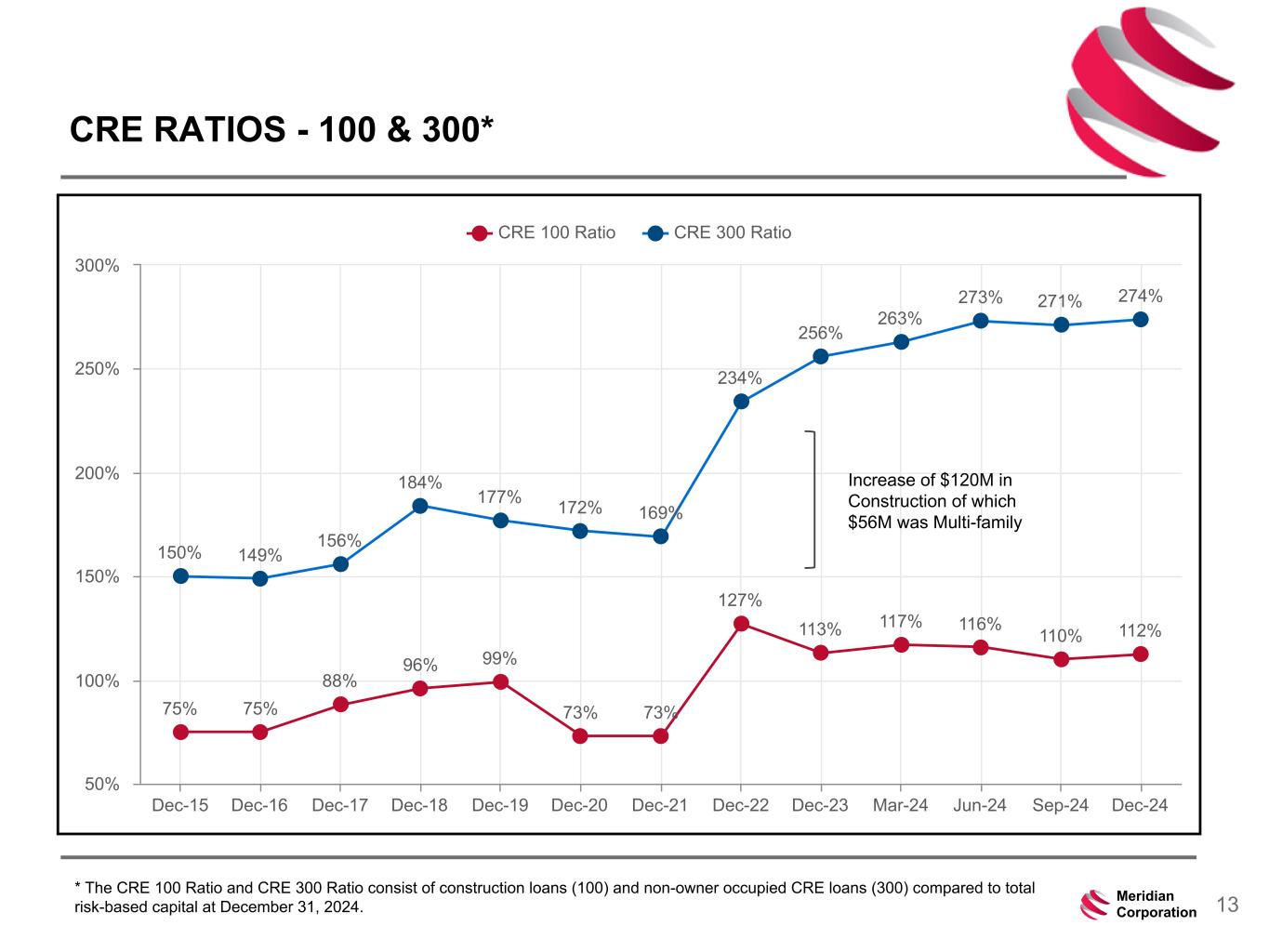 239 15 75 111 111 113 186 12 47 0 0 0 234 234 234 186 12 0 112 173 71 13Meridian Corporation CRE RATIOS - 100 & 300* 75% 75% 88% 96% 99% 73% 73% 127% 113% 117% 116% 110% 112% 150% 149% 156% 184% 177% 172% 169% 234% 256% 263% 273% 271% 274% CRE 100 Ratio CRE 300 Ratio Dec-15 Dec-16 Dec-17 Dec-18 Dec-19 Dec-20 Dec-21 Dec-22 Dec-23 Mar-24 Jun-24 Sep-24 Dec-24 50% 100% 150% 200% 250% 300% Increase of $120M in Construction of which $56M was Multi-family * The CRE 100 Ratio and CRE 300 Ratio consist of construction loans (100) and non-owner occupied CRE loans (300) compared to total risk-based capital at December 31, 2024.