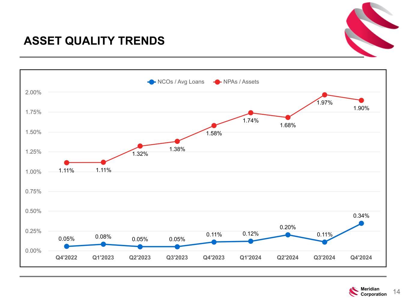239 15 75 111 111 113 186 12 47 0 0 0 234 234 234 186 12 0 112 173 71 14Meridian Corporation ASSET QUALITY TRENDS 0.05% 0.08% 0.05% 0.05% 0.11% 0.12% 0.20% 0.11% 0.34% 1.11% 1.11% 1.32% 1.38% 1.58% 1.74% 1.68% 1.97% 1.90% NCOs / Avg Loans NPAs / Assets Q4'2022 Q1'2023 Q2'2023 Q3'2023 Q4'2023 Q1'2024 Q2'2024 Q3'2024 Q4'2024 0.00% 0.25% 0.50% 0.75% 1.00% 1.25% 1.50% 1.75% 2.00%