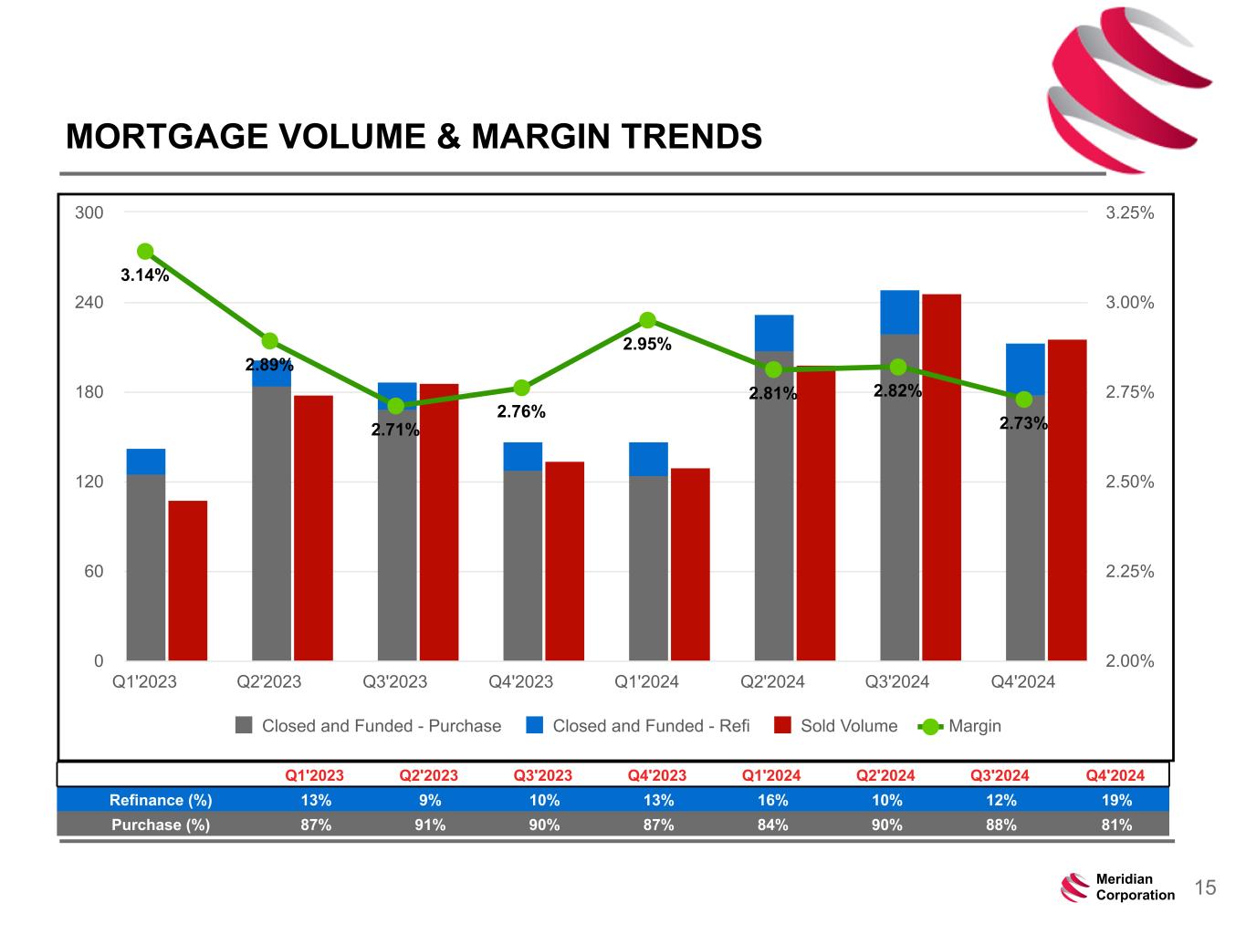 239 15 75 111 111 113 186 12 47 0 0 0 234 234 234 186 12 0 112 173 71 15Meridian Corporation MORTGAGE VOLUME & MARGIN TRENDS 3.14% 2.89% 2.71% 2.76% 2.95% 2.81% 2.82% 2.73% Closed and Funded - Purchase Closed and Funded - Refi Sold Volume Margin Q1'2023 Q2'2023 Q3'2023 Q4'2023 Q1'2024 Q2'2024 Q3'2024 Q4'2024 0 60 120 180 240 300 2.00% 2.25% 2.50% 2.75% 3.00% 3.25% Q1'2023 Q2'2023 Q3'2023 Q4'2023 Q1'2024 Q2'2024 Q3'2024 Q4'2024 Refinance (%) 13% 9% 10% 13% 16% 10% 12% 19% Purchase (%) 87% 91% 90% 87% 84% 90% 88% 81%