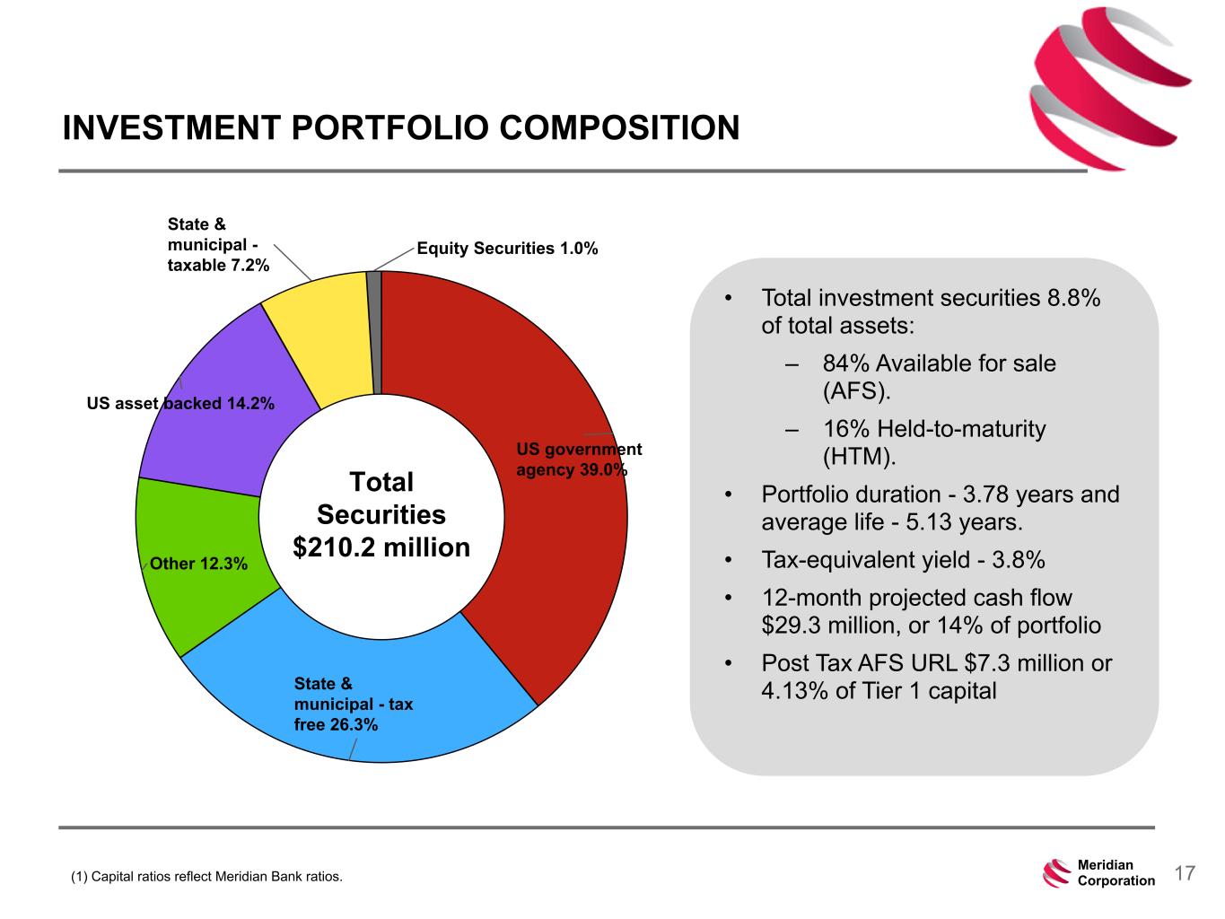 239 15 75 111 111 113 186 12 47 0 0 0 234 234 234 186 12 0 112 173 71 17Meridian Corporation INVESTMENT PORTFOLIO COMPOSITION • Total investment securities 8.8% of total assets: – 84% Available for sale (AFS). – 16% Held-to-maturity (HTM). • Portfolio duration - 3.78 years and average life - 5.13 years. • Tax-equivalent yield - 3.8% • 12-month projected cash flow $29.3 million, or 14% of portfolio • Post Tax AFS URL $7.3 million or 4.13% of Tier 1 capital (1) Capital ratios reflect Meridian Bank ratios. US government agency 39.0% State & municipal - tax free 26.3% Other 12.3% US asset backed 14.2% State & municipal - taxable 7.2% Equity Securities 1.0% Total Securities $210.2 million