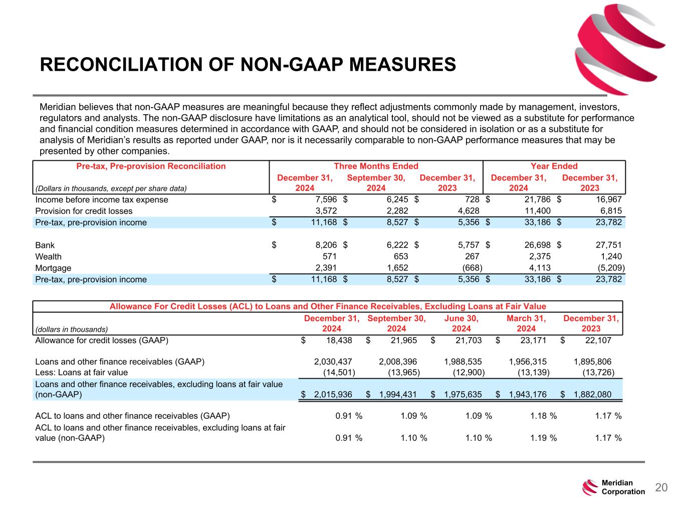 239 15 75 111 111 113 186 12 47 0 0 0 234 234 234 186 12 0 112 173 71 20Meridian Corporation Allowance For Credit Losses (ACL) to Loans and Other Finance Receivables, Excluding Loans at Fair Value (dollars in thousands) December 31, 2024 September 30, 2024 June 30, 2024 March 31, 2024 December 31, 2023 Allowance for credit losses (GAAP) $ 18,438 $ 21,965 $ 21,703 $ 23,171 $ 22,107 Loans and other finance receivables (GAAP) 2,030,437 2,008,396 1,988,535 1,956,315 1,895,806 Less: Loans at fair value (14,501) (13,965) (12,900) (13,139) (13,726) Loans and other finance receivables, excluding loans at fair value (non-GAAP) $ 2,015,936 $ 1,994,431 $ 1,975,635 $ 1,943,176 $ 1,882,080 ACL to loans and other finance receivables (GAAP) 0.91 % 1.09 % 1.09 % 1.18 % 1.17 % ACL to loans and other finance receivables, excluding loans at fair value (non-GAAP) 0.91 % 1.10 % 1.10 % 1.19 % 1.17 % RECONCILIATION OF NON-GAAP MEASURES Meridian believes that non-GAAP measures are meaningful because they reflect adjustments commonly made by management, investors, regulators and analysts. The non-GAAP disclosure have limitations as an analytical tool, should not be viewed as a substitute for performance and financial condition measures determined in accordance with GAAP, and should not be considered in isolation or as a substitute for analysis of Meridian’s results as reported under GAAP, nor is it necessarily comparable to non-GAAP performance measures that may be presented by other companies. Pre-tax, Pre-provision Reconciliation Three Months Ended Year Ended (Dollars in thousands, except per share data) December 31, 2024 September 30, 2024 December 31, 2023 December 31, 2024 December 31, 2023 Income before income tax expense $ 7,596 $ 6,245 $ 728 $ 21,786 $ 16,967 Provision for credit losses 3,572 2,282 4,628 11,400 6,815 Pre-tax, pre-provision income $ 11,168 $ 8,527 $ 5,356 $ 33,186 $ 23,782 Bank $ 8,206 $ 6,222 $ 5,757 $ 26,698 $ 27,751 Wealth 571 653 267 2,375 1,240 Mortgage 2,391 1,652 (668) 4,113 (5,209) Pre-tax, pre-provision income $ 11,168 $ 8,527 $ 5,356 $ 33,186 $ 23,782