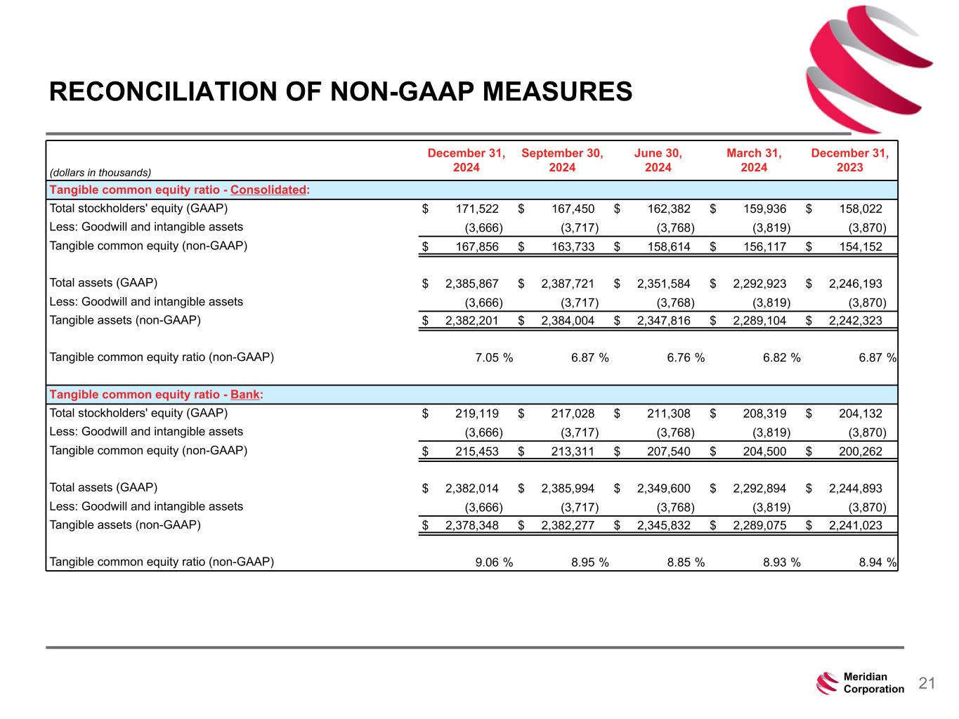 239 15 75 111 111 113 186 12 47 0 0 0 234 234 234 186 12 0 112 173 71 21Meridian Corporation (dollars in thousands) December 31, 2024 September 30, 2024 June 30, 2024 March 31, 2024 December 31, 2023 Tangible common equity ratio - Consolidated: Total stockholders' equity (GAAP) $ 171,522 $ 167,450 $ 162,382 $ 159,936 $ 158,022 Less: Goodwill and intangible assets (3,666) (3,717) (3,768) (3,819) (3,870) Tangible common equity (non-GAAP) $ 167,856 $ 163,733 $ 158,614 $ 156,117 $ 154,152 Total assets (GAAP) $ 2,385,867 $ 2,387,721 $ 2,351,584 $ 2,292,923 $ 2,246,193 Less: Goodwill and intangible assets (3,666) (3,717) (3,768) (3,819) (3,870) Tangible assets (non-GAAP) $ 2,382,201 $ 2,384,004 $ 2,347,816 $ 2,289,104 $ 2,242,323 Tangible common equity ratio (non-GAAP) 7.05 % 6.87 % 6.76 % 6.82 % 6.87 % Tangible common equity ratio - Bank: Total stockholders' equity (GAAP) $ 219,119 $ 217,028 $ 211,308 $ 208,319 $ 204,132 Less: Goodwill and intangible assets (3,666) (3,717) (3,768) (3,819) (3,870) Tangible common equity (non-GAAP) $ 215,453 $ 213,311 $ 207,540 $ 204,500 $ 200,262 Total assets (GAAP) $ 2,382,014 $ 2,385,994 $ 2,349,600 $ 2,292,894 $ 2,244,893 Less: Goodwill and intangible assets (3,666) (3,717) (3,768) (3,819) (3,870) Tangible assets (non-GAAP) $ 2,378,348 $ 2,382,277 $ 2,345,832 $ 2,289,075 $ 2,241,023 Tangible common equity ratio (non-GAAP) 9.06 % 8.95 % 8.85 % 8.93 % 8.94 % RECONCILIATION OF NON-GAAP MEASURES