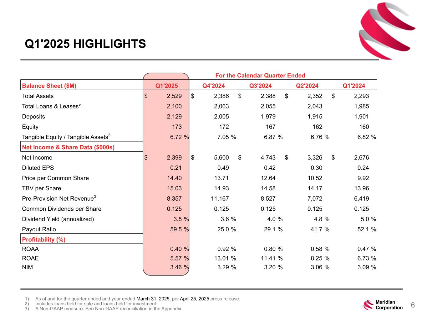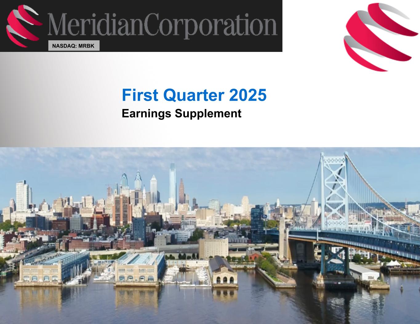 239 15 75 111 111 113 186 12 47 0 0 0 234 234 234 186 12 0 112 173 71 6Meridian Corporation Q1'2025 HIGHLIGHTS 1) As of and for the quarter ended and year ended March 31, 2025, per April 25, 2025 press release. 2) Includes loans held for sale and loans held for investment. 3) A Non-GAAP measure. See Non-GAAP reconciliation in the Appendix. For the Calendar Quarter Ended Balance Sheet ($M) Q1'2025 Q4'2024 Q3'2024 Q2'2024 Q1'2024 Total Assets $ 2,529 $ 2,386 $ 2,388 $ 2,352 $ 2,293 Total Loans & Leases² 2,100 2,063 2,055 2,043 1,985 Deposits 2,129 2,005 1,979 1,915 1,901 Equity 173 172 167 162 160 Tangible Equity / Tangible Assets3 6.72 % 7.05 % 6.87 % 6.76 % 6.82 % Net Income & Share Data ($000s) Net Income $ 2,399 $ 5,600 $ 4,743 $ 3,326 $ 2,676 Diluted EPS 0.21 0.49 0.42 0.30 0.24 Price per Common Share 14.40 13.71 12.64 10.52 9.92 TBV per Share 15.03 14.93 14.58 14.17 13.96 Pre-Provision Net Revenue3 8,357 11,167 8,527 7,072 6,419 Common Dividends per Share 0.125 0.125 0.125 0.125 0.125 Dividend Yield (annualized) 3.5 % 3.6 % 4.0 % 4.8 % 5.0 % Payout Ratio 59.5 % 25.0 % 29.1 % 41.7 % 52.1 % Profitability (%) ROAA 0.40 % 0.92 % 0.80 % 0.58 % 0.47 % ROAE 5.57 % 13.01 % 11.41 % 8.25 % 6.73 % NIM 3.46 % 3.29 % 3.20 % 3.06 % 3.09 %