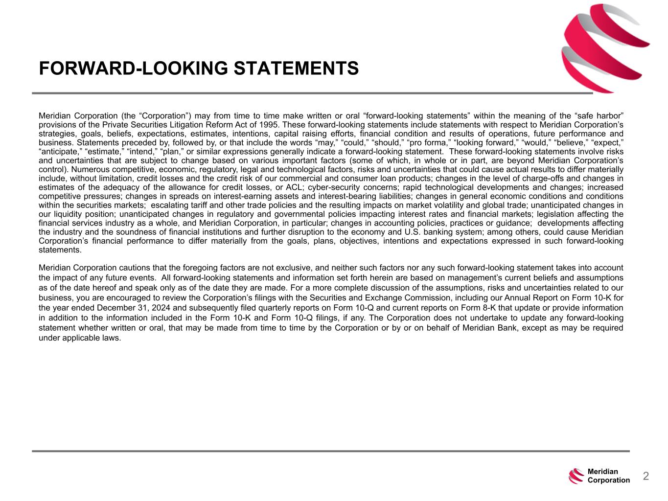 239 15 75 111 111 113 186 12 47 0 0 0 234 234 234 186 12 0 112 173 71 2Meridian Corporation FORWARD-LOOKING STATEMENTS Meridian Corporation (the “Corporation”) may from time to time make written or oral “forward-looking statements” within the meaning of the “safe harbor” provisions of the Private Securities Litigation Reform Act of 1995. These forward-looking statements include statements with respect to Meridian Corporation’s strategies, goals, beliefs, expectations, estimates, intentions, capital raising efforts, financial condition and results of operations, future performance and business. Statements preceded by, followed by, or that include the words “may,” “could,” “should,” “pro forma,” “looking forward,” “would,” “believe,” “expect,” “anticipate,” “estimate,” “intend,” “plan,” or similar expressions generally indicate a forward-looking statement. These forward-looking statements involve risks and uncertainties that are subject to change based on various important factors (some of which, in whole or in part, are beyond Meridian Corporation’s control). Numerous competitive, economic, regulatory, legal and technological factors, risks and uncertainties that could cause actual results to differ materially include, without limitation, credit losses and the credit risk of our commercial and consumer loan products; changes in the level of charge-offs and changes in estimates of the adequacy of the allowance for credit losses, or ACL; cyber-security concerns; rapid technological developments and changes; increased competitive pressures; changes in spreads on interest-earning assets and interest-bearing liabilities; changes in general economic conditions and conditions within the securities markets; escalating tariff and other trade policies and the resulting impacts on market volatility and global trade; unanticipated changes in our liquidity position; unanticipated changes in regulatory and governmental policies impacting interest rates and financial markets; legislation affecting the financial services industry as a whole, and Meridian Corporation, in particular; changes in accounting policies, practices or guidance; developments affecting the industry and the soundness of financial institutions and further disruption to the economy and U.S. banking system; among others, could cause Meridian Corporation’s financial performance to differ materially from the goals, plans, objectives, intentions and expectations expressed in such forward-looking statements. Meridian Corporation cautions that the foregoing factors are not exclusive, and neither such factors nor any such forward-looking statement takes into account the impact of any future events. All forward-looking statements and information set forth herein are based on management’s current beliefs and assumptions as of the date hereof and speak only as of the date they are made. For a more complete discussion of the assumptions, risks and uncertainties related to our business, you are encouraged to review the Corporation’s filings with the Securities and Exchange Commission, including our Annual Report on Form 10-K for the year ended December 31, 2024 and subsequently filed quarterly reports on Form 10-Q and current reports on Form 8-K that update or provide information in addition to the information included in the Form 10-K and Form 10-Q filings, if any. The Corporation does not undertake to update any forward-looking statement whether written or oral, that may be made from time to time by the Corporation or by or on behalf of Meridian Bank, except as may be required under applicable laws.