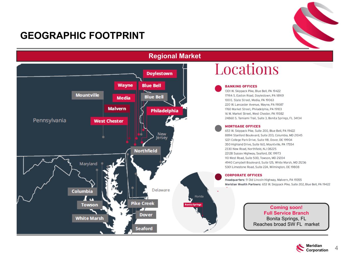 239 15 75 111 111 113 186 12 47 0 0 0 234 234 234 186 12 0 112 173 71 4Meridian Corporation GEOGRAPHIC FOOTPRINT Regional Market Coming soon! Full Service Branch Bonita Springs, FL Reaches broad SW FL market