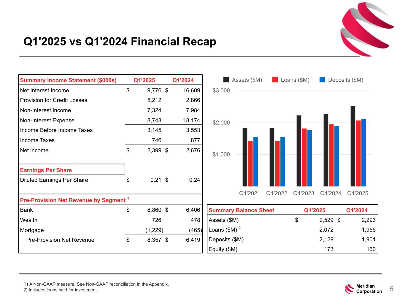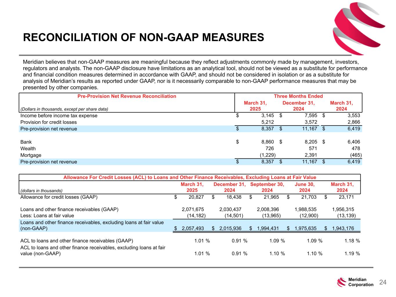 239 15 75 111 111 113 186 12 47 0 0 0 234 234 234 186 12 0 112 173 71 24Meridian Corporation Allowance For Credit Losses (ACL) to Loans and Other Finance Receivables, Excluding Loans at Fair Value (dollars in thousands) March 31, 2025 December 31, 2024 September 30, 2024 June 30, 2024 March 31, 2024 Allowance for credit losses (GAAP) $ 20,827 $ 18,438 $ 21,965 $ 21,703 $ 23,171 Loans and other finance receivables (GAAP) 2,071,675 2,030,437 2,008,396 1,988,535 1,956,315 Less: Loans at fair value (14,182) (14,501) (13,965) (12,900) (13,139) Loans and other finance receivables, excluding loans at fair value (non-GAAP) $ 2,057,493 $ 2,015,936 $ 1,994,431 $ 1,975,635 $ 1,943,176 ACL to loans and other finance receivables (GAAP) 1.01 % 0.91 % 1.09 % 1.09 % 1.18 % ACL to loans and other finance receivables, excluding loans at fair value (non-GAAP) 1.01 % 0.91 % 1.10 % 1.10 % 1.19 % RECONCILIATION OF NON-GAAP MEASURES Meridian believes that non-GAAP measures are meaningful because they reflect adjustments commonly made by management, investors, regulators and analysts. The non-GAAP disclosure have limitations as an analytical tool, should not be viewed as a substitute for performance and financial condition measures determined in accordance with GAAP, and should not be considered in isolation or as a substitute for analysis of Meridian’s results as reported under GAAP, nor is it necessarily comparable to non-GAAP performance measures that may be presented by other companies. Pre-Provision Net Revenue Reconciliation Three Months Ended (Dollars in thousands, except per share data) March 31, 2025 December 31, 2024 March 31, 2024 Income before income tax expense $ 3,145 $ 7,595 $ 3,553 Provision for credit losses 5,212 3,572 2,866 Pre-provision net revenue $ 8,357 $ 11,167 $ 6,419 Bank $ 8,860 $ 8,205 $ 6,406 Wealth 726 571 478 Mortgage (1,229) 2,391 (465) Pre-provision net revenue $ 8,357 $ 11,167 $ 6,419