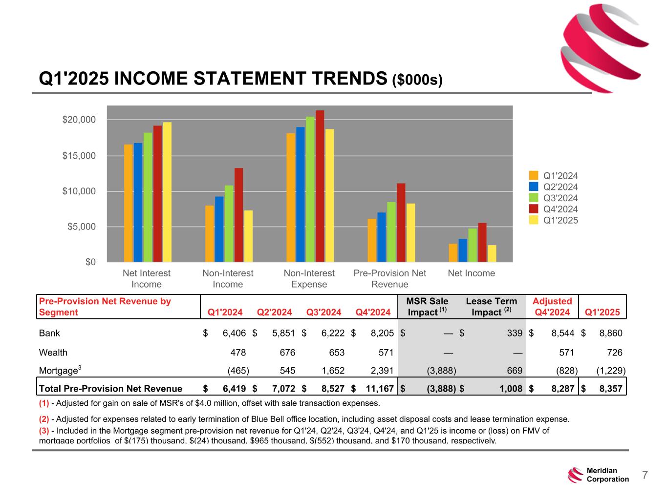239 15 75 111 111 113 186 12 47 0 0 0 234 234 234 186 12 0 112 173 71 7Meridian Corporation Q1'2025 INCOME STATEMENT TRENDS ($000s) Pre-Provision Net Revenue by Segment Q1'2024 Q2'2024 Q3'2024 Q4'2024 MSR Sale Impact (1) Lease Term Impact (2) Adjusted Q4'2024 Q1'2025 Bank $ 6,406 $ 5,851 $ 6,222 $ 8,205 $ — $ 339 $ 8,544 $ 8,860 Wealth 478 676 653 571 — — 571 726 Mortgage3 (465) 545 1,652 2,391 (3,888) 669 (828) (1,229) Total Pre-Provision Net Revenue $ 6,419 $ 7,072 $ 8,527 $ 11,167 $ (3,888) $ 1,008 $ 8,287 $ 8,357 (1) - Adjusted for gain on sale of MSR's of $4.0 million, offset with sale transaction expenses. (2) - Adjusted for expenses related to early termination of Blue Bell office location, including asset disposal costs and lease termination expense. (3) - Included in the Mortgage segment pre-provision net revenue for Q1'24, Q2'24, Q3'24, Q4'24, and Q1'25 is income or (loss) on FMV of mortgage portfolios of $(175) thousand, $(24) thousand, $965 thousand, $(552) thousand, and $170 thousand, respectively. Q1'2024 Q2'2024 Q3'2024 Q4'2024 Q1'2025 Net Interest Income Non-Interest Income Non-Interest Expense Pre-Provision Net Revenue Net Income $0 $5,000 $10,000 $15,000 $20,000