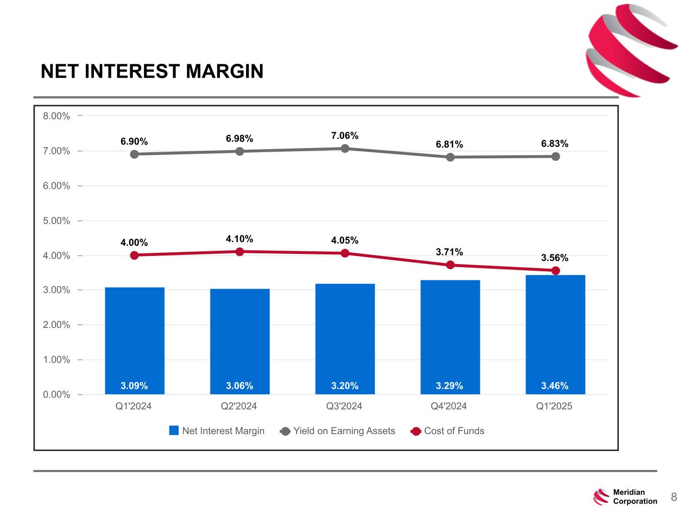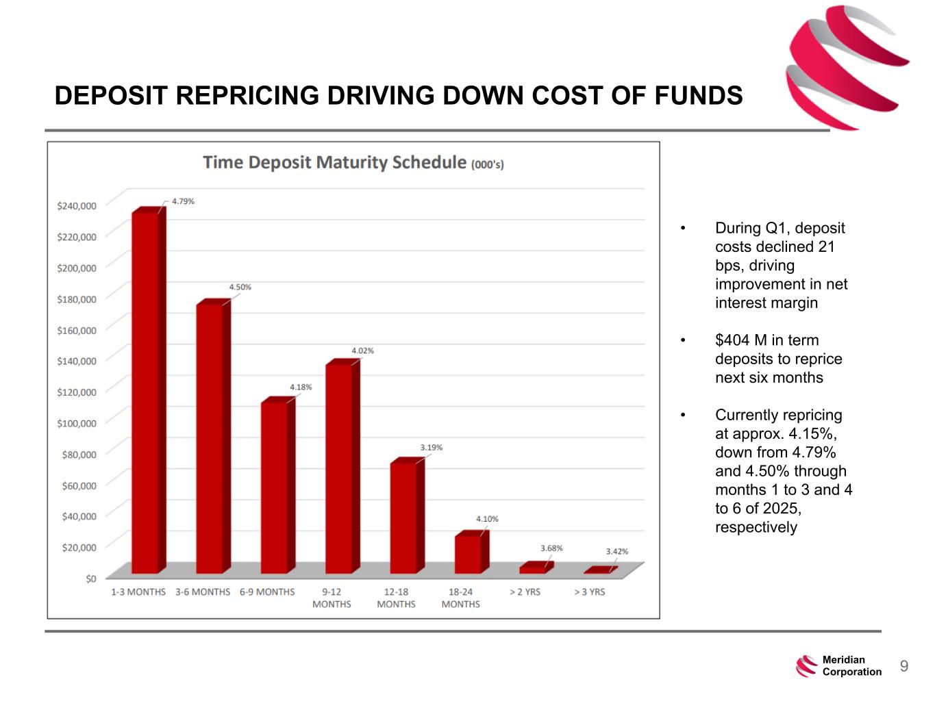 239 15 75 111 111 113 186 12 47 0 0 0 234 234 234 186 12 0 112 173 71 8Meridian Corporation NET INTEREST MARGIN 3.09% 3.06% 3.20% 3.29% 3.46% 6.90% 6.98% 7.06% 6.81% 6.83% 4.00% 4.10% 4.05% 3.71% 3.56% Net Interest Margin Yield on Earning Assets Cost of Funds Q1'2024 Q2'2024 Q3'2024 Q4'2024 Q1'2025 0.00% 1.00% 2.00% 3.00% 4.00% 5.00% 6.00% 7.00% 8.00%