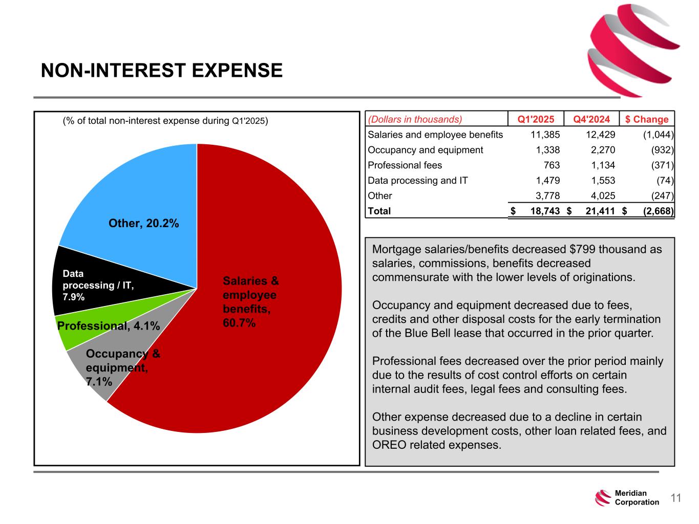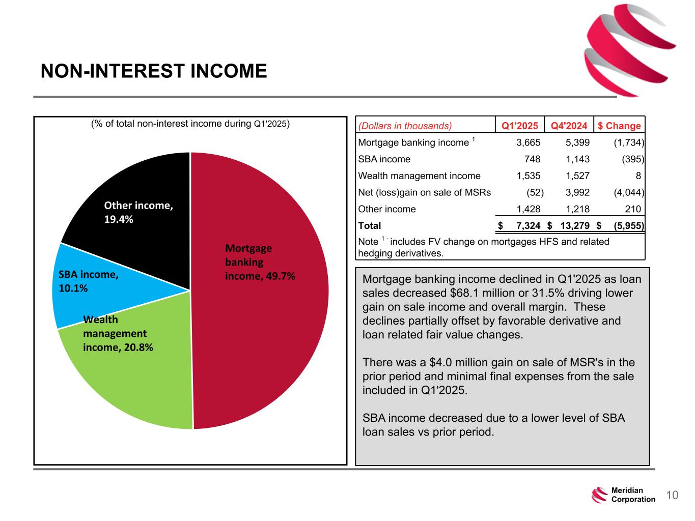 239 15 75 111 111 113 186 12 47 0 0 0 234 234 234 186 12 0 112 173 71 10Meridian Corporation NON-INTEREST INCOME (Dollars in thousands) Q1'2025 Q4'2024 $ Change Mortgage banking income 1 3,665 5,399 (1,734) SBA income 748 1,143 (395) Wealth management income 1,535 1,527 8 Net (loss)gain on sale of MSRs (52) 3,992 (4,044) Other income 1,428 1,218 210 Total $ 7,324 $ 13,279 $ (5,955) Note 1 - includes FV change on mortgages HFS and related hedging derivatives.Mortgage banking income, 49.7% Wealth management income, 20.8% SBA income, 10.1% Other income, 19.4% Mortgage banking income declined in Q1'2025 as loan sales decreased $68.1 million or 31.5% driving lower gain on sale income and overall margin. These declines partially offset by favorable derivative and loan related fair value changes. There was a $4.0 million gain on sale of MSR's in the prior period and minimal final expenses from the sale included in Q1'2025. SBA income decreased due to a lower level of SBA loan sales vs prior period. (% of total non-interest income during Q1'2025)
