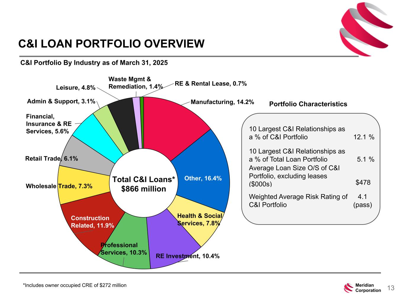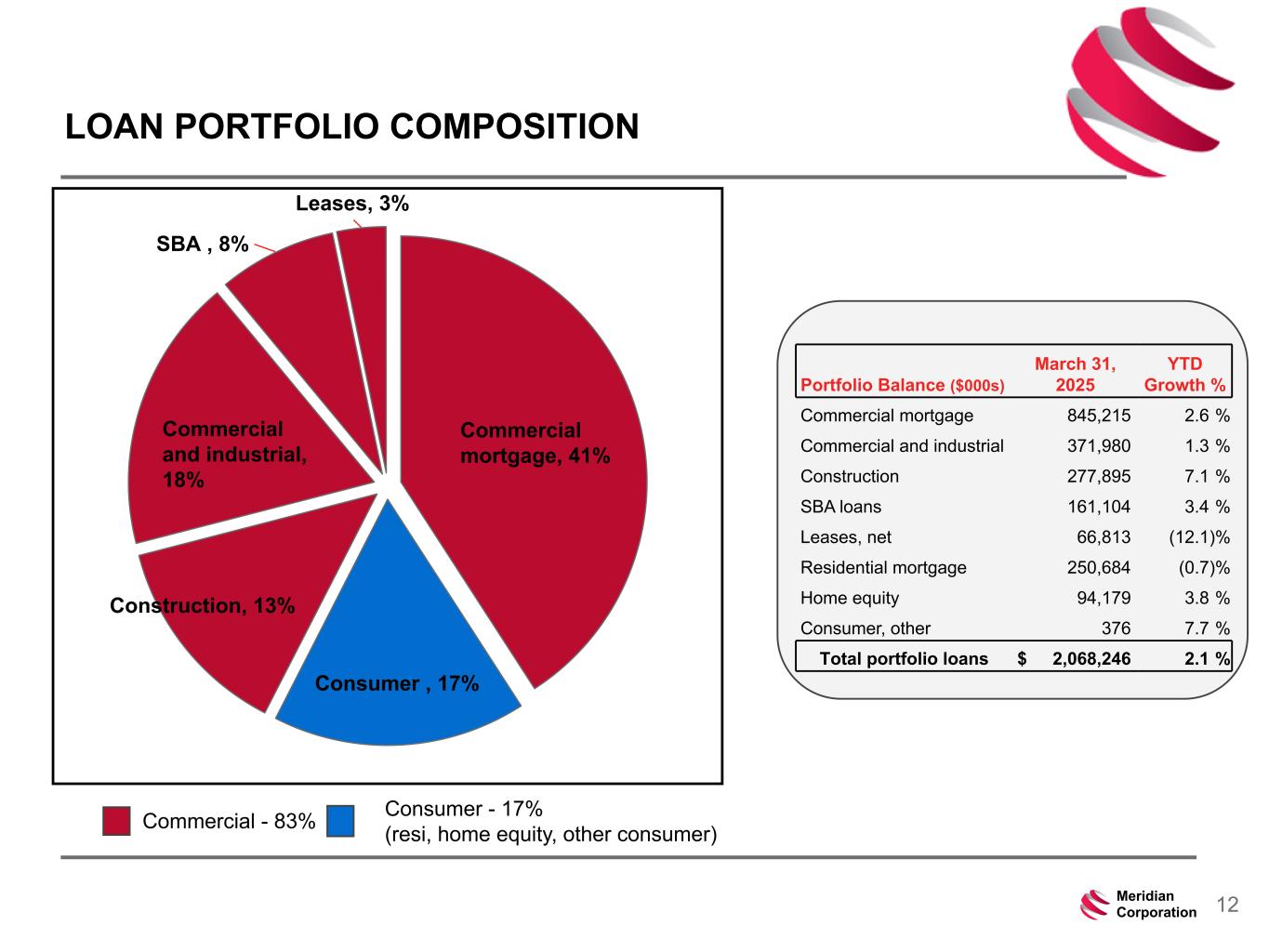 239 15 75 111 111 113 186 12 47 0 0 0 234 234 234 186 12 0 112 173 71 12Meridian Corporation LOAN PORTFOLIO COMPOSITION Portfolio Balance ($000s) March 31, 2025 YTD Growth % Commercial mortgage 845,215 2.6 % Commercial and industrial 371,980 1.3 % Construction 277,895 7.1 % SBA loans 161,104 3.4 % Leases, net 66,813 (12.1) % Residential mortgage 250,684 (0.7) % Home equity 94,179 3.8 % Consumer, other 376 7.7 % Total portfolio loans $ 2,068,246 2.1 % Commercial mortgage, 41% Consumer , 17% Construction, 13% Commercial and industrial, 18% SBA , 8% Leases, 3% Commercial - 83% Consumer - 17% (resi, home equity, other consumer)