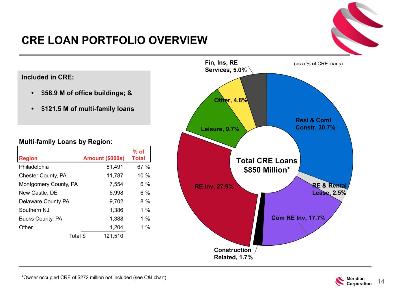 239 15 75 111 111 113 186 12 47 0 0 0 234 234 234 186 12 0 112 173 71 14Meridian Corporation Resi & Coml Constr, 30.7% RE & Rental Lease, 2.5% Com RE Inv, 17.7% Construction Related, 1.7% RE Inv, 27.9% Leisure, 9.7% Other, 4.8% Fin, Ins, RE Services, 5.0% CRE LOAN PORTFOLIO OVERVIEW Total CRE Loans $850 Million* (as a % of CRE loans) *Owner occupied CRE of $272 million not included (see C&I chart) Included in CRE: • $58.9 M of office buildings; & • $121.5 M of multi-family loans Multi-family Loans by Region: Region Amount ($000s) % of Total Philadelphia 81,491 67 % Chester County, PA 11,787 10 % Montgomery County, PA 7,554 6 % New Castle, DE 6,998 6 % Delaware County PA 9,702 8 % Southern NJ 1,386 1 % Bucks County, PA 1,388 1 % Other 1,204 1 % Total $ 121,510