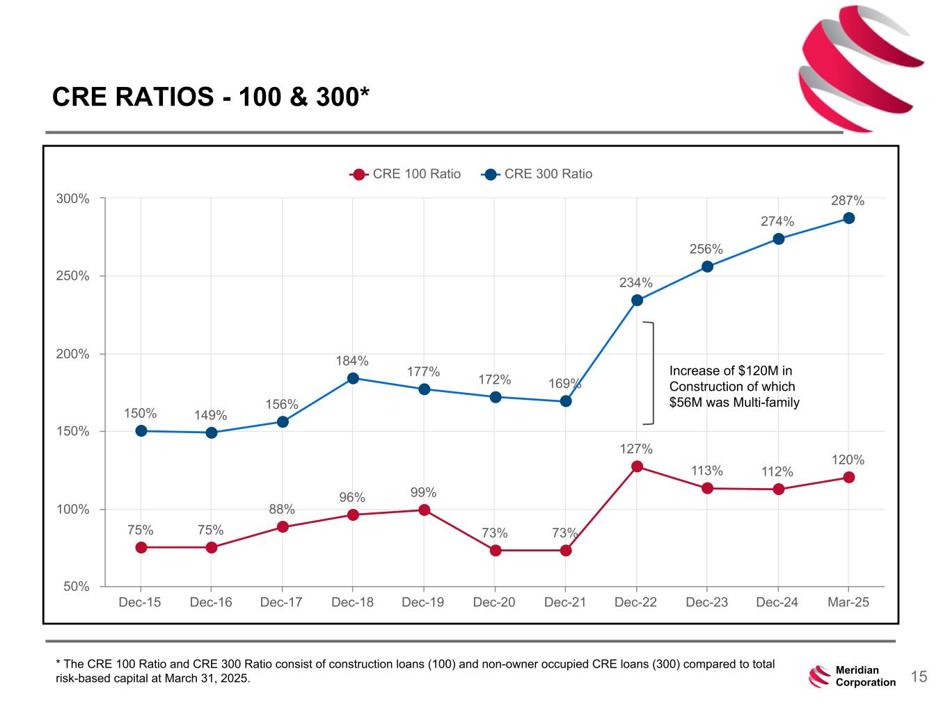 239 15 75 111 111 113 186 12 47 0 0 0 234 234 234 186 12 0 112 173 71 15Meridian Corporation CRE RATIOS - 100 & 300* 75% 75% 88% 96% 99% 73% 73% 127% 113% 112% 120% 150% 149% 156% 184% 177% 172% 169% 234% 256% 274% 287% CRE 100 Ratio CRE 300 Ratio Dec-15 Dec-16 Dec-17 Dec-18 Dec-19 Dec-20 Dec-21 Dec-22 Dec-23 Dec-24 Mar-25 50% 100% 150% 200% 250% 300% Increase of $120M in Construction of which $56M was Multi-family * The CRE 100 Ratio and CRE 300 Ratio consist of construction loans (100) and non-owner occupied CRE loans (300) compared to total risk-based capital at March 31, 2025.