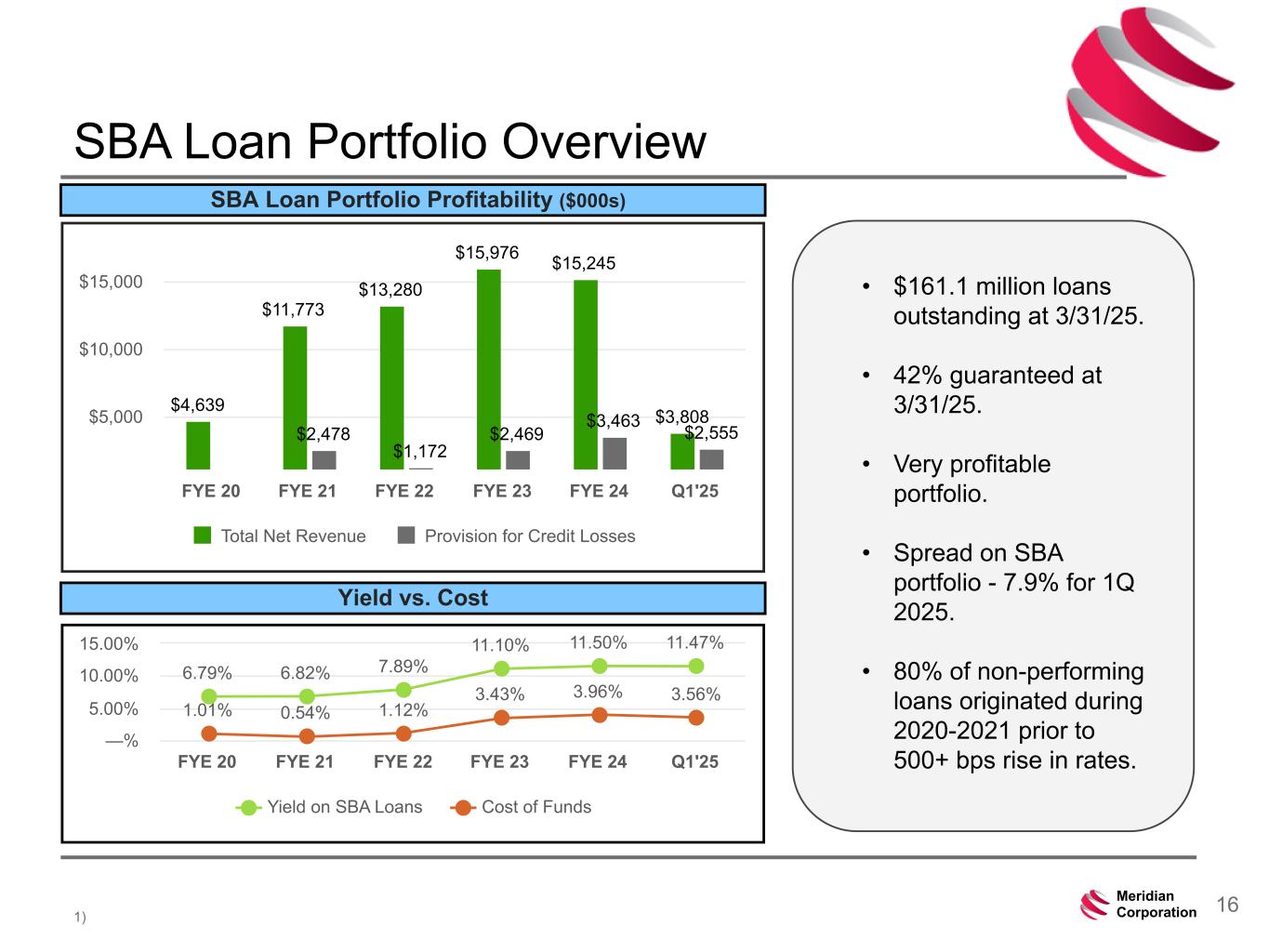 239 15 75 111 111 113 186 12 47 0 0 0 234 234 234 186 12 0 112 173 71 16Meridian Corporation 6.79% 6.82% 7.89% 11.10% 11.50% 11.47% 1.01% 0.54% 1.12% 3.43% 3.96% 3.56% Yield on SBA Loans Cost of Funds FYE 20 FYE 21 FYE 22 FYE 23 FYE 24 Q1'25 —% 5.00% 10.00% 15.00% SBA Loan Portfolio Overview 1) SBA Loan Portfolio Profitability ($000s) Yield vs. Cost $4,639 $11,773 $13,280 $15,976 $15,245 $3,808 $2,478 $1,172 $2,469 $3,463 $2,555 Total Net Revenue Provision for Credit Losses FYE 20 FYE 21 FYE 22 FYE 23 FYE 24 Q1'25 $5,000 $10,000 $15,000 • $161.1 million loans outstanding at 3/31/25. • 42% guaranteed at 3/31/25. • Very profitable portfolio. • Spread on SBA portfolio - 7.9% for 1Q 2025. • 80% of non-performing loans originated during 2020-2021 prior to 500+ bps rise in rates.