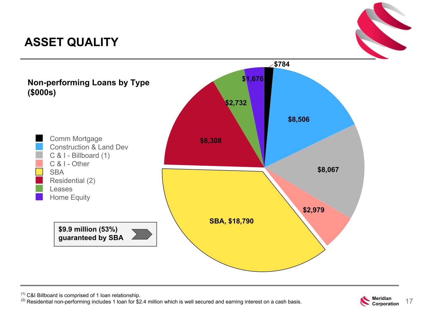 239 15 75 111 111 113 186 12 47 0 0 0 234 234 234 186 12 0 112 173 71 17Meridian Corporation ASSET QUALITY $784 $8,506 $8,067 $2,979 SBA, $18,790 $8,308 $2,732 $1,676 Comm Mortgage Construction & Land Dev C & I - Billboard (1) C & I - Other SBA Residential (2) Leases Home Equity Non-performing Loans by Type ($000s) $9.9 million (53%) guaranteed by SBA (1) C&I Billboard is comprised of 1 loan relationship. (2) Residential non-performing includes 1 loan for $2.4 million which is well secured and earning interest on a cash basis.
