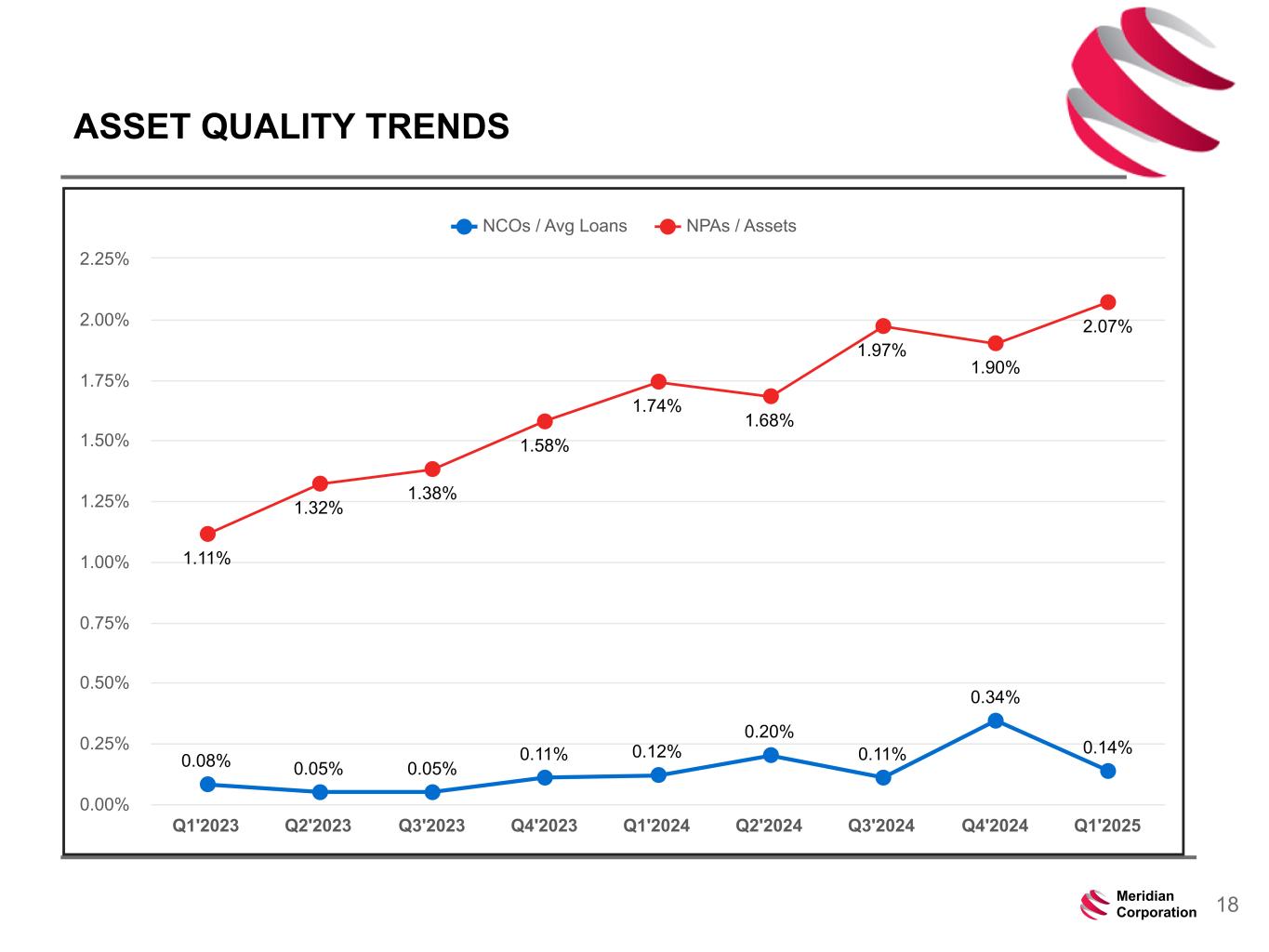 239 15 75 111 111 113 186 12 47 0 0 0 234 234 234 186 12 0 112 173 71 18Meridian Corporation ASSET QUALITY TRENDS 0.08% 0.05% 0.05% 0.11% 0.12% 0.20% 0.11% 0.34% 0.14% 1.11% 1.32% 1.38% 1.58% 1.74% 1.68% 1.97% 1.90% 2.07% NCOs / Avg Loans NPAs / Assets Q1'2023 Q2'2023 Q3'2023 Q4'2023 Q1'2024 Q2'2024 Q3'2024 Q4'2024 Q1'2025 0.00% 0.25% 0.50% 0.75% 1.00% 1.25% 1.50% 1.75% 2.00% 2.25%