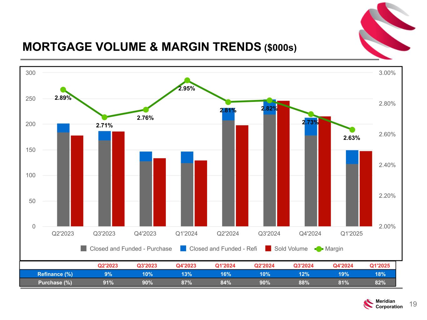 239 15 75 111 111 113 186 12 47 0 0 0 234 234 234 186 12 0 112 173 71 19Meridian Corporation MORTGAGE VOLUME & MARGIN TRENDS ($000s) 2.89% 2.71% 2.76% 2.95% 2.81% 2.82% 2.73% 2.63% Closed and Funded - Purchase Closed and Funded - Refi Sold Volume Margin Q2'2023 Q3'2023 Q4'2023 Q1'2024 Q2'2024 Q3'2024 Q4'2024 Q1'2025 0 50 100 150 200 250 300 2.00% 2.20% 2.40% 2.60% 2.80% 3.00% Q2'2023 Q3'2023 Q4'2023 Q1'2024 Q2'2024 Q3'2024 Q4'2024 Q1'2025 Refinance (%) 9% 10% 13% 16% 10% 12% 19% 18% Purchase (%) 91% 90% 87% 84% 90% 88% 81% 82%