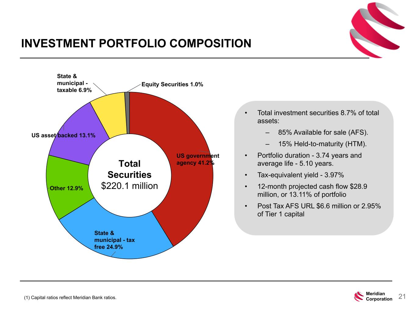 239 15 75 111 111 113 186 12 47 0 0 0 234 234 234 186 12 0 112 173 71 21Meridian Corporation INVESTMENT PORTFOLIO COMPOSITION • Total investment securities 8.7% of total assets: – 85% Available for sale (AFS). – 15% Held-to-maturity (HTM). • Portfolio duration - 3.74 years and average life - 5.10 years. • Tax-equivalent yield - 3.97% • 12-month projected cash flow $28.9 million, or 13.11% of portfolio • Post Tax AFS URL $6.6 million or 2.95% of Tier 1 capital (1) Capital ratios reflect Meridian Bank ratios. US government agency 41.2% State & municipal - tax free 24.9% Other 12.9% US asset backed 13.1% State & municipal - taxable 6.9% Equity Securities 1.0% Total Securities $220.1 million