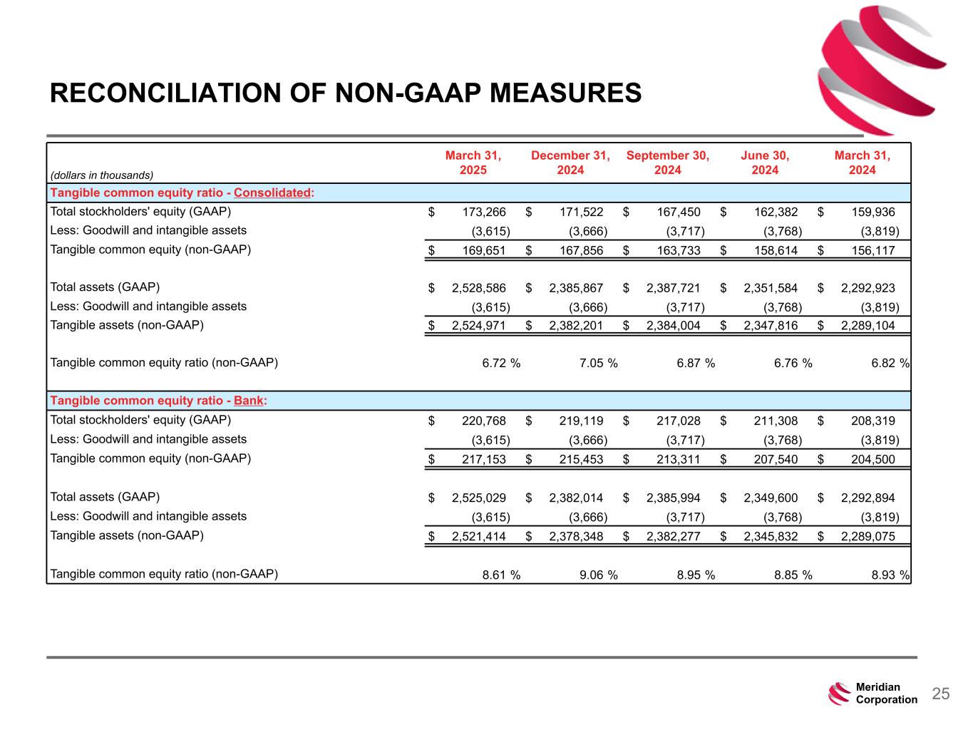 239 15 75 111 111 113 186 12 47 0 0 0 234 234 234 186 12 0 112 173 71 25Meridian Corporation (dollars in thousands) March 31, 2025 December 31, 2024 September 30, 2024 June 30, 2024 March 31, 2024 Tangible common equity ratio - Consolidated: Total stockholders' equity (GAAP) $ 173,266 $ 171,522 $ 167,450 $ 162,382 $ 159,936 Less: Goodwill and intangible assets (3,615) (3,666) (3,717) (3,768) (3,819) Tangible common equity (non-GAAP) $ 169,651 $ 167,856 $ 163,733 $ 158,614 $ 156,117 Total assets (GAAP) $ 2,528,586 $ 2,385,867 $ 2,387,721 $ 2,351,584 $ 2,292,923 Less: Goodwill and intangible assets (3,615) (3,666) (3,717) (3,768) (3,819) Tangible assets (non-GAAP) $ 2,524,971 $ 2,382,201 $ 2,384,004 $ 2,347,816 $ 2,289,104 Tangible common equity ratio (non-GAAP) 6.72 % 7.05 % 6.87 % 6.76 % 6.82 % Tangible common equity ratio - Bank: Total stockholders' equity (GAAP) $ 220,768 $ 219,119 $ 217,028 $ 211,308 $ 208,319 Less: Goodwill and intangible assets (3,615) (3,666) (3,717) (3,768) (3,819) Tangible common equity (non-GAAP) $ 217,153 $ 215,453 $ 213,311 $ 207,540 $ 204,500 Total assets (GAAP) $ 2,525,029 $ 2,382,014 $ 2,385,994 $ 2,349,600 $ 2,292,894 Less: Goodwill and intangible assets (3,615) (3,666) (3,717) (3,768) (3,819) Tangible assets (non-GAAP) $ 2,521,414 $ 2,378,348 $ 2,382,277 $ 2,345,832 $ 2,289,075 Tangible common equity ratio (non-GAAP) 8.61 % 9.06 % 8.95 % 8.85 % 8.93 % RECONCILIATION OF NON-GAAP MEASURES