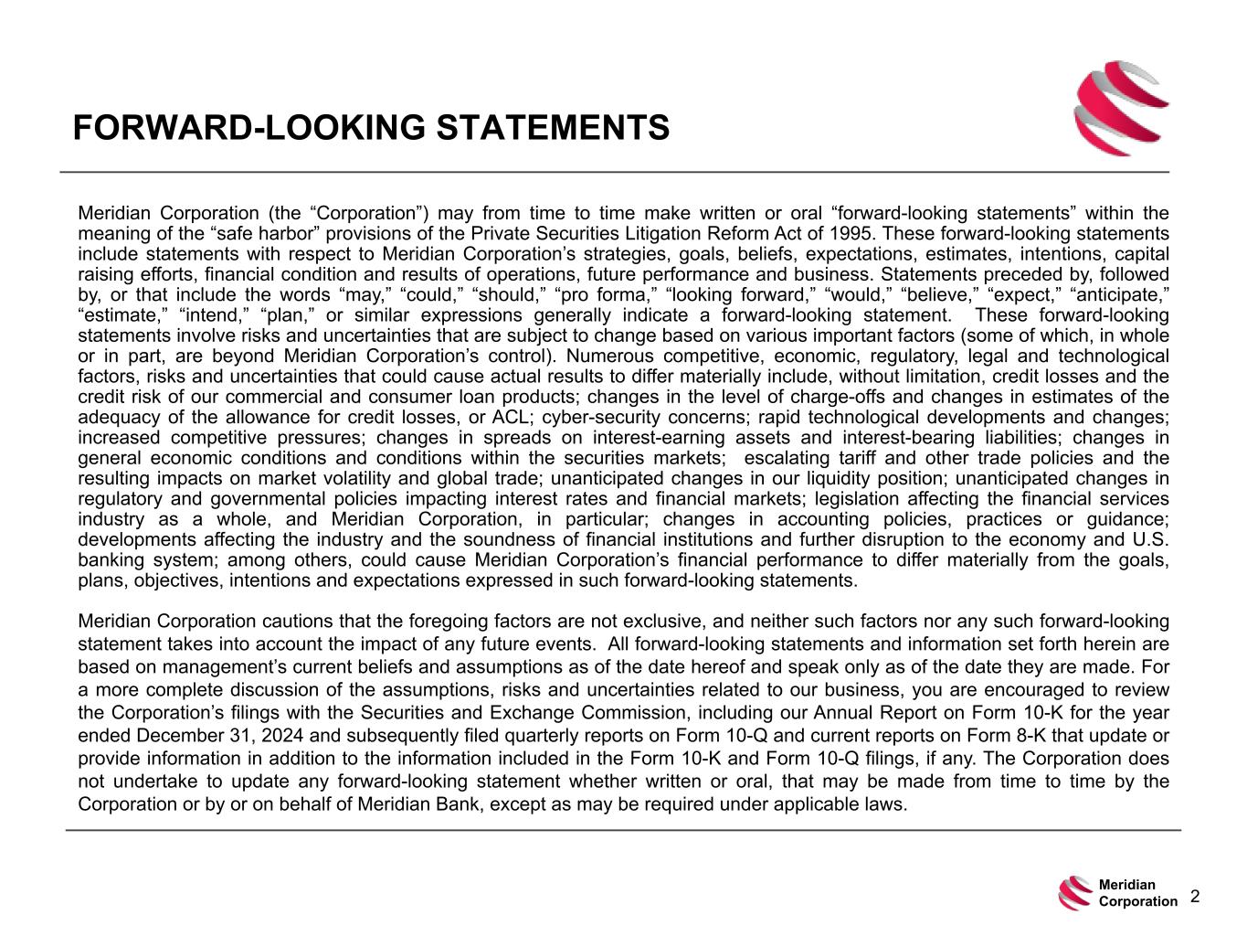 FORWARD-LOOKING STATEMENTS Meridian Corporation (the “Corporation”) may from time to time make written or oral “forward-looking statements” within the meaning of the “safe harbor” provisions of the Private Securities Litigation Reform Act of 1995. These forward-looking statements include statements with respect to Meridian Corporation’s strategies, goals, beliefs, expectations, estimates, intentions, capital raising efforts, financial condition and results of operations, future performance and business. Statements preceded by, followed by, or that include the words “may,” “could,” “should,” “pro forma,” “looking forward,” “would,” “believe,” “expect,” “anticipate,” “estimate,” “intend,” “plan,” or similar expressions generally indicate a forward-looking statement. These forward-looking statements involve risks and uncertainties that are subject to change based on various important factors (some of which, in whole or in part, are beyond Meridian Corporation’s control). Numerous competitive, economic, regulatory, legal and technological factors, risks and uncertainties that could cause actual results to differ materially include, without limitation, credit losses and the credit risk of our commercial and consumer loan products; changes in the level of charge-offs and changes in estimates of the adequacy of the allowance for credit losses, or ACL; cyber-security concerns; rapid technological developments and changes; increased competitive pressures; changes in spreads on interest-earning assets and interest-bearing liabilities; changes in general economic conditions and conditions within the securities markets; escalating tariff and other trade policies and the resulting impacts on market volatility and global trade; unanticipated changes in our liquidity position; unanticipated changes in regulatory and governmental policies impacting interest rates and financial markets; legislation affecting the financial services industry as a whole, and Meridian Corporation, in particular; changes in accounting policies, practices or guidance; developments affecting the industry and the soundness of financial institutions and further disruption to the economy and U.S. banking system; among others, could cause Meridian Corporation’s financial performance to differ materially from the goals, plans, objectives, intentions and expectations expressed in such forward-looking statements. Meridian Corporation cautions that the foregoing factors are not exclusive, and neither such factors nor any such forward-looking statement takes into account the impact of any future events. All forward-looking statements and information set forth herein are based on management’s current beliefs and assumptions as of the date hereof and speak only as of the date they are made. For a more complete discussion of the assumptions, risks and uncertainties related to our business, you are encouraged to review the Corporation’s filings with the Securities and Exchange Commission, including our Annual Report on Form 10-K for the year ended December 31, 2024 and subsequently filed quarterly reports on Form 10-Q and current reports on Form 8-K that update or provide information in addition to the information included in the Form 10-K and Form 10-Q filings, if any. The Corporation does not undertake to update any forward-looking statement whether written or oral, that may be made from time to time by the Corporation or by or on behalf of Meridian Bank, except as may be required under applicable laws. Meridian Corporation 2